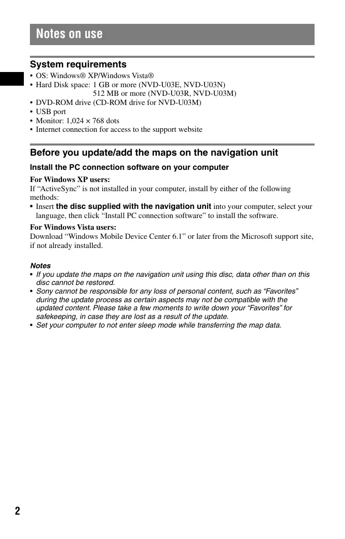 - All other trademarks are trademarks of their respective owners. Operating Instructions GB Customer Support Portal If you have any questions or for the latest support information on navigation, visit the website below: For customers in U.S.A. http://www.sony.com/nav-u/support For customers in Canada http://www.sony.ca/nav-u For customers in Mexico http://esupport.sony.com/ES/LA/ For customers in Europe http://www.navu.sony-europe.com/support Sony Corporation Printed in Japan NVD-U03E NVD-U03M NVD-U03N NVD-U03R ©2009 Sony Corporation Printed in Japan Notes on use System requirements