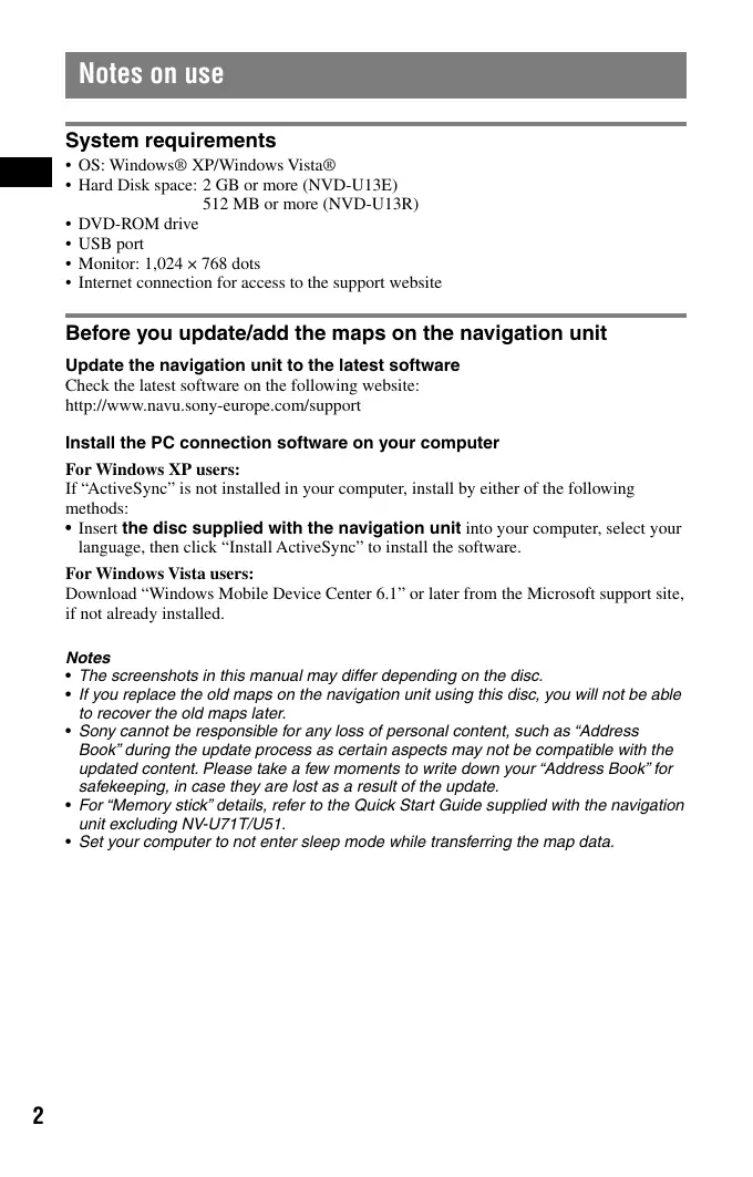 - Internet connection for access to the support website Before you update/add the maps on the navigation unit Update the navigation unit to the latest software Check the latest software on the following website: http://www.navu.sony-europe.com/support Install the PC connection software on your computer For Windows XP users: If “ActiveSync” is not installed in your computer, install by either of the following methods: