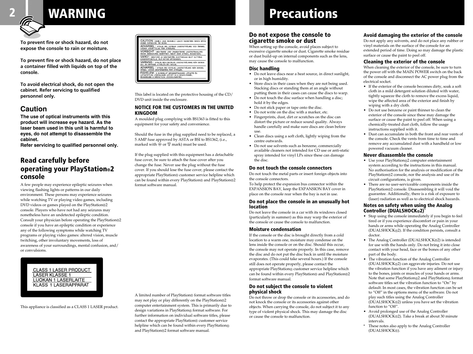 WARNING Precautions Do not expose the console to cigarette smoke or dust To prevent fire or shock hazard, do not expose the console to rain or moisture. When setting up the console, avoid places subject to excessive cigarette smoke or dust. Cigarette smoke residue or dust build-up on internal components such as the lens, may cause the console to malfunction. To prevent fire or shock hazard, do not place a container filled with liquids on top of the console. To avoid electrical shock, do not open the cabinet. Refer servicing to qualified personnel only. Caution The use of optical instruments with this product will increase eye hazard. As the laser beam used in this unit is harmful to eyes, do not attempt to disassemble the cabinet. Refer servicing to qualified personnel only. Read carefully before operating your PlayStation®2 console A few people may experience epileptic seizures when viewing flashing lights or patterns in our daily environment. These persons may experience seizures while watching TV or playing video games, including DVD videos or games played on the PlayStation®2 console. Players who have not had any seizures may nonetheless have an undetected epileptic condition. Consult your physician before operating the PlayStation®2 console if you have an epileptic condition or experience any of the following symptoms while watching TV programs or playing video games: altered vision, muscle twitching, other involuntary movements, loss of awareness of your surroundings, mental confusion, and/ or convulsions. This appliance is classified as a CLASS 1 LASER product. Disc handling This label is located on the protective housing of the CD/ DVD unit inside the enclosure. NOTICE FOR THE CUSTOMERS IN THE UNITED KINGDOM A moulded plug complying with BS1363 is fitted to this equipment for your safety and convenience. Should the fuse in the plug supplied need to be replaced, a 5 AMP fuse approved by ASTA or BSI to BS1362, (i.e., marked with 2 or @ mark) must be used. If the plug supplied with this equipment has a detachable fuse cover, be sure to attach the fuse cover after you change the fuse. Never use the plug without the fuse cover. If you should lose the fuse cover, please contact the appropriate PlayStation® customer service helpline which can be found within every PlayStation® and PlayStation®2 format software manual.