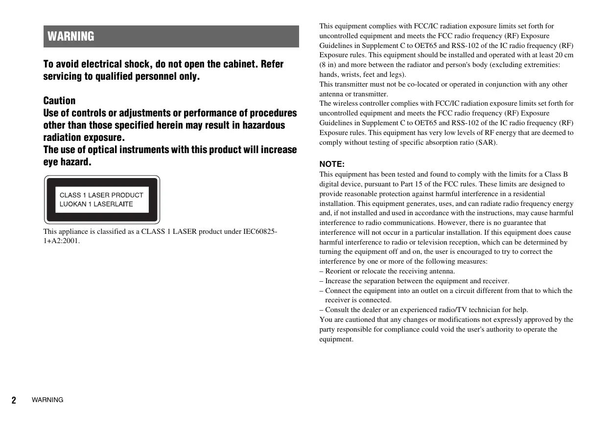 WARNING To avoid electrical shock, do not open the cabinet. Refer servicing to qualified personnel only. Caution Use of controls or adjustments or performance of procedures other than those specified herein may result in hazardous radiation exposure. The use of optical instruments with this product will increase eye hazard. This appliance is classified as a CLASS 1 LASER product under IEC608251+A2:2001.