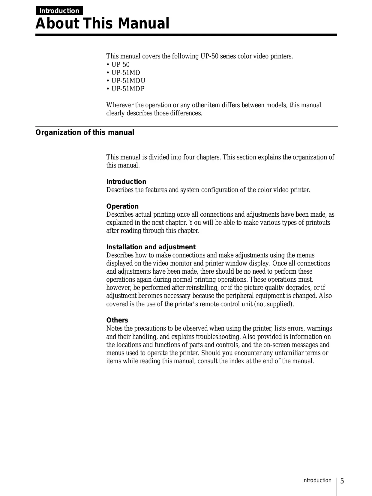 The UP-50 series color video printer is designed for capturing images from video equipment such as a VTR, and for printing out high resolution images in full color (with 256 shades per color, a total of more than 16,700,000 colors in all) in high resolution print mode (approximately 300 dpi). You can make various types of printouts. You can also add a caption to the printout. You can carry out ordinary printer operation by using the buttons and setup the printer interactively by picking from displayed menus.