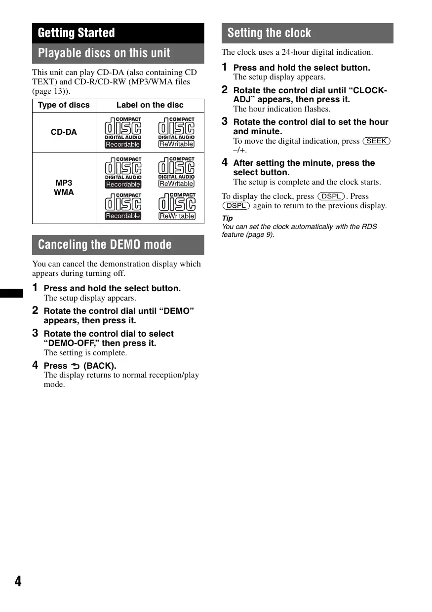 After setting the minute, press the select button. The setup is complete and the clock starts. Label on the disc CD-DA MP3 WMA To display the clock, press (DSPL). Press (DSPL) again to return to the previous display. Tip You can set the clock automatically with the RDS feature (page 9). Canceling the DEMO mode You can cancel the demonstration display which appears during turning off.