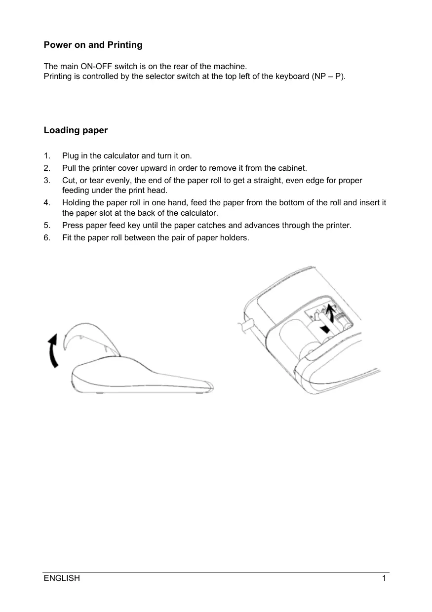 Power on and Printing The main ON-OFF switch is on the rear of the machine. Printing is controlled by the selector switch at the top left of the keyboard (NP – P). Plug in the calculator and turn it on. Pull the printer cover upward in order to remove it from the cabinet. Cut, or tear evenly, the end of the paper roll to get a straight, even edge for proper feeding under the print head. Holding the paper roll in one hand, feed the paper from the bottom of the roll and insert it the paper slot at the back of the calculator. Press paper feed key until the paper catches and advances through the printer. Fit the paper roll between the pair of paper holders. ENGLISH