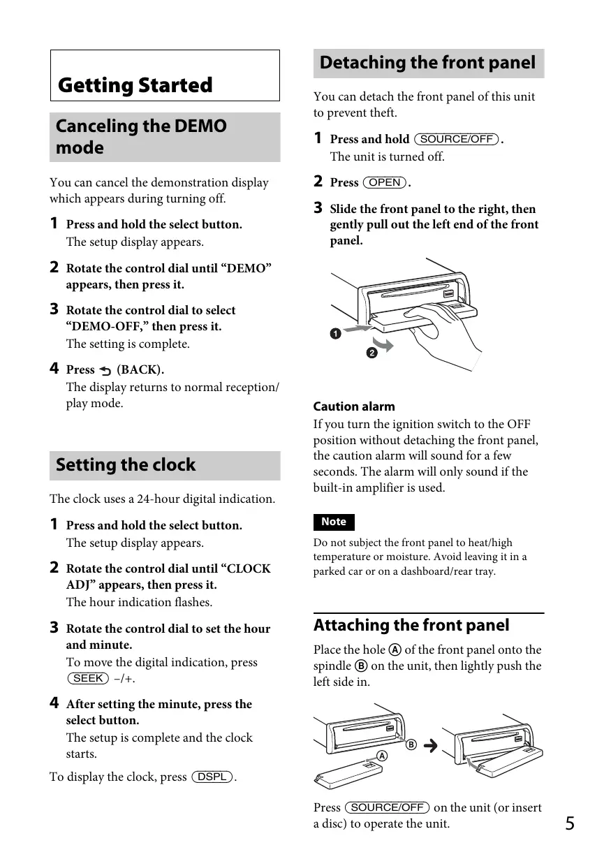 Caution alarm If you turn the ignition switch to the OFF position without detaching the front panel, the caution alarm will sound for a few seconds. The alarm will only sound if the built-in amplifier is used. Note Do not subject the front panel to heat/high temperature or moisture. Avoid leaving it in a parked car or on a dashboard/rear tray.
