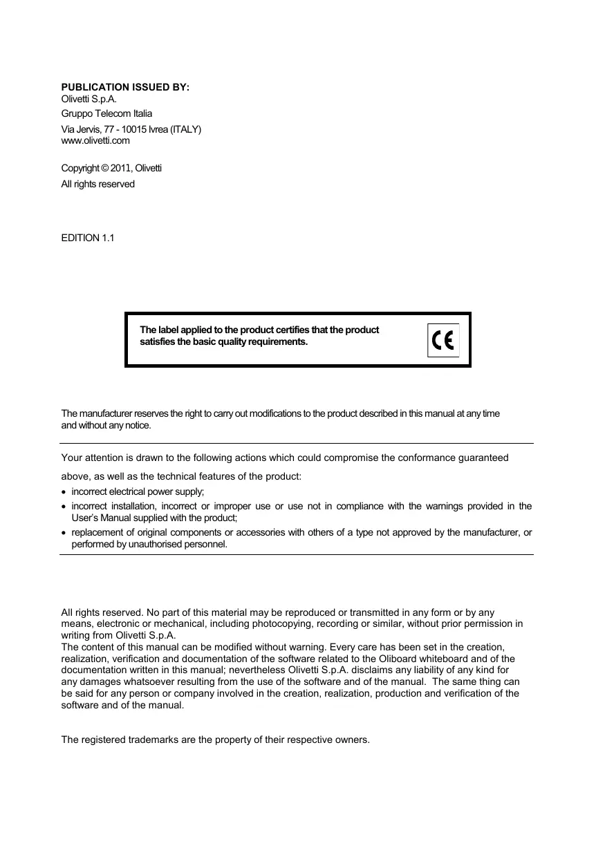 The content of this manual can be modified without warning. Every care has been set in the creation, realization, verification and documentation of the software related to the Oliboard whiteboard and of the documentation written in this manual; nevertheless Olivetti S.p.A. disclaims any liability of any kind for any damages whatsoever resulting from the use of the software and of the manual. The same thing can be said for any person or company involved in the creation, realization, production and verification of the software and of the manual.