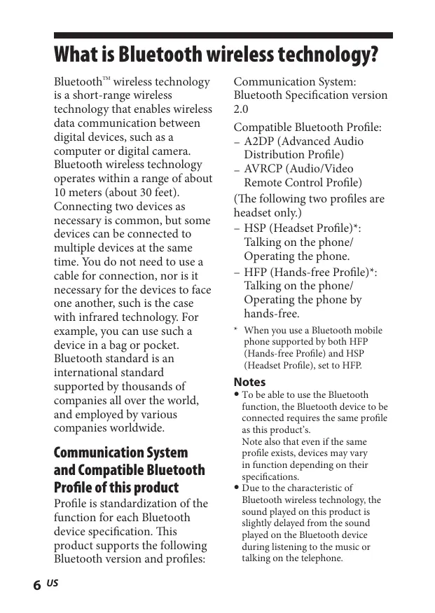 Communication System: Bluetooth Specification version Compatible Bluetooth Profile: – A2DP (Advanced Audio Distribution Profile) – AVRCP (Audio/Video Remote Control Profile) (The following two profiles are headset only.) – HSP (Headset Profile)*: Talking on the phone/ Operating the phone. – HFP (Hands-free Profile)*: Talking on the phone/ Operating the phone by hands-free.