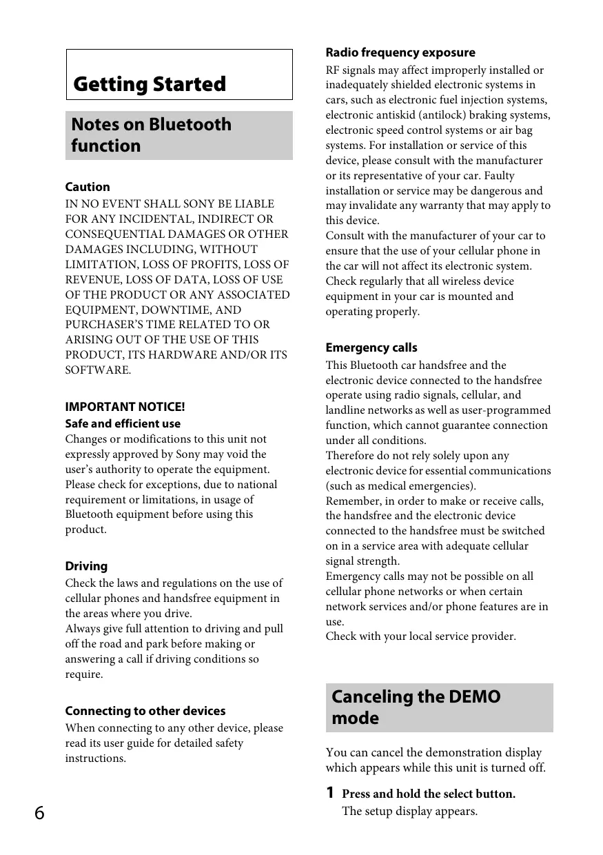 Getting Started Notes on Bluetooth function Caution IN NO EVENT SHALL SONY BE LIABLE FOR ANY INCIDENTAL, INDIRECT OR CONSEQUENTIAL DAMAGES OR OTHER DAMAGES INCLUDING, WITHOUT LIMITATION, LOSS OF PROFITS, LOSS OF REVENUE, LOSS OF DATA, LOSS OF USE OF THE PRODUCT OR ANY ASSOCIATED EQUIPMENT, DOWNTIME, AND PURCHASER’S TIME RELATED TO OR ARISING OUT OF THE USE OF THIS PRODUCT, ITS HARDWARE AND/OR ITS SOFTWARE.