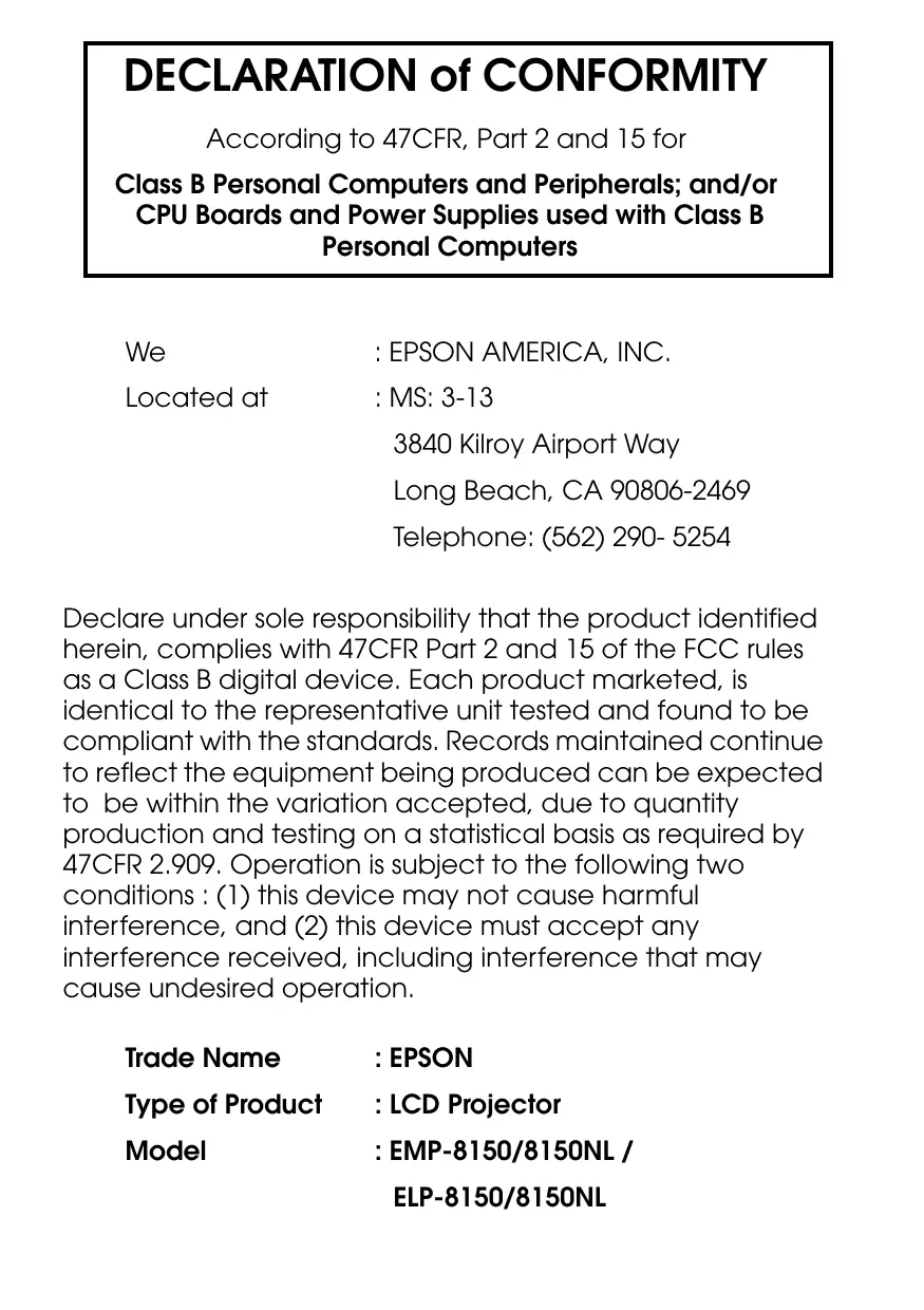 : EPSON AMERICA, INC. Located at : MS: 3-13 3840 Kilroy Airport Way Long Beach, CA 90806-2469 Telephone: (562) 290- 5254 Declare under sole responsibility that the product identified herein, complies with 47CFR Part 2 and 15 of the FCC rules as a Class B digital device. Each product marketed, is identical to the representative unit tested and found to be compliant with the standards. Records maintained continue to reflect the equipment being produced can be expected to be within the variation accepted, due to quantity production and testing on a statistical basis as required by 47CFR 2.909. Operation is subject to the following two conditions : (1) this device may not cause harmful interference, and (2) this device must accept any interference received, including interference that may cause undesired operation. Trade Name : EPSON Type of Product : LCD Projector Model : EMP-8150/8150NL / ELP-8150/8150NL FCC Compliance Statement For United States Users This equipment has been tested and found to comply with the limits for a Class B digital device, pursuant to Part 15 of the FCC Rules. These limits are designed to provide reasonable protection against harmful interference in a residential installation. This equipment generates, uses, and can radiate radio frequency energy and, if not installed and used in accordance with the instructions, may cause harmful interference to radio or television reception. However, there is no guarantee that interference will not occur in a particular installation. If this equipment does cause interference to radio and television reception, which can be determined by turning the equipment off and on, the user is encouraged to try to correct the interference by one or more of the following measures.