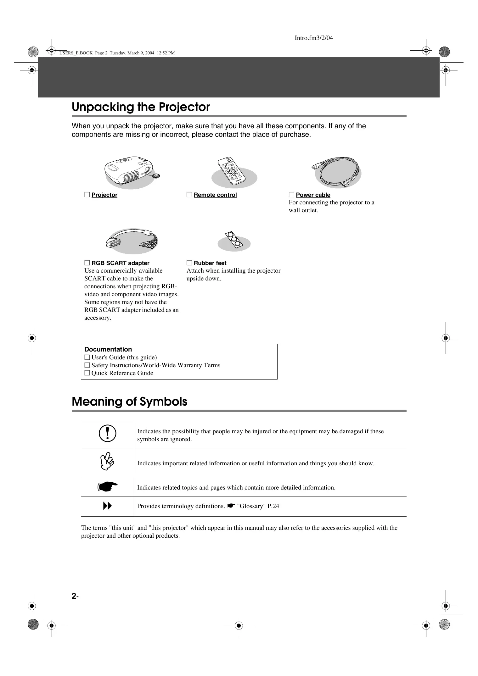 USERS_E.BOOK Page 2 Tuesday, March 9, 2004 12:52 PM Unpacking the Projector When you unpack the projector, make sure that you have all these components. If any of the components are missing or incorrect, please contact the place of purchase.