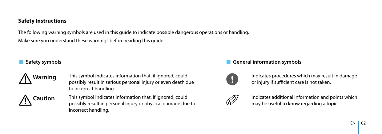 Contents Contents.........................................................................................................02 Safety Instructions The following warning symbols are used in this guide to indicate possible dangerous operations or handling. Make sure you understand these warnings before reading this guide. f Safety symbols f General information symbols Warning This symbol indicates information that, if ignored, could possibly result in serious personal injury or even death due to incorrect handling. Indicates procedures which may result in damage or injury if sufficient care is not taken. Caution This symbol indicates information that, if ignored, could possibly result in personal injury or physical damage due to incorrect handling. Indicates additional information and points which may be useful to know regarding a topic.