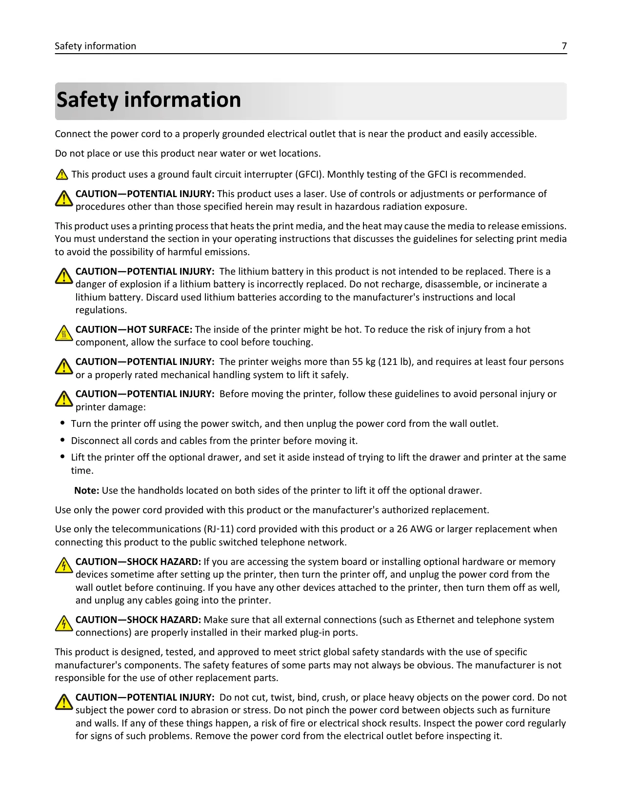 Safety information Connect the power cord to a properly grounded electrical outlet that is near the product and easily accessible. Do not place or use this product near water or wet locations. This product uses a ground fault circuit interrupter (GFCI). Monthly testing of the GFCI is recommended. CAUTION—POTENTIAL INJURY: This product uses a laser. Use of controls or adjustments or performance of procedures other than those specified herein may result in hazardous radiation exposure. This product uses a printing process that heats the print media, and the heat may cause the media to release emissions. You must understand the section in your operating instructions that discusses the guidelines for selecting print media to avoid the possibility of harmful emissions. CAUTION—POTENTIAL INJURY: The lithium battery in this product is not intended to be replaced. There is a danger of explosion if a lithium battery is incorrectly replaced. Do not recharge, disassemble, or incinerate a lithium battery. Discard used lithium batteries according to the manufacturer's instructions and local regulations. CAUTION—HOT SURFACE: The inside of the printer might be hot. To reduce the risk of injury from a hot component, allow the surface to cool before touching. CAUTION—POTENTIAL INJURY: The printer weighs more than 55 kg (121 lb), and requires at least four persons or a properly rated mechanical handling system to lift it safely. CAUTION—POTENTIAL INJURY: Before moving the printer, follow these guidelines to avoid personal injury or printer damage: