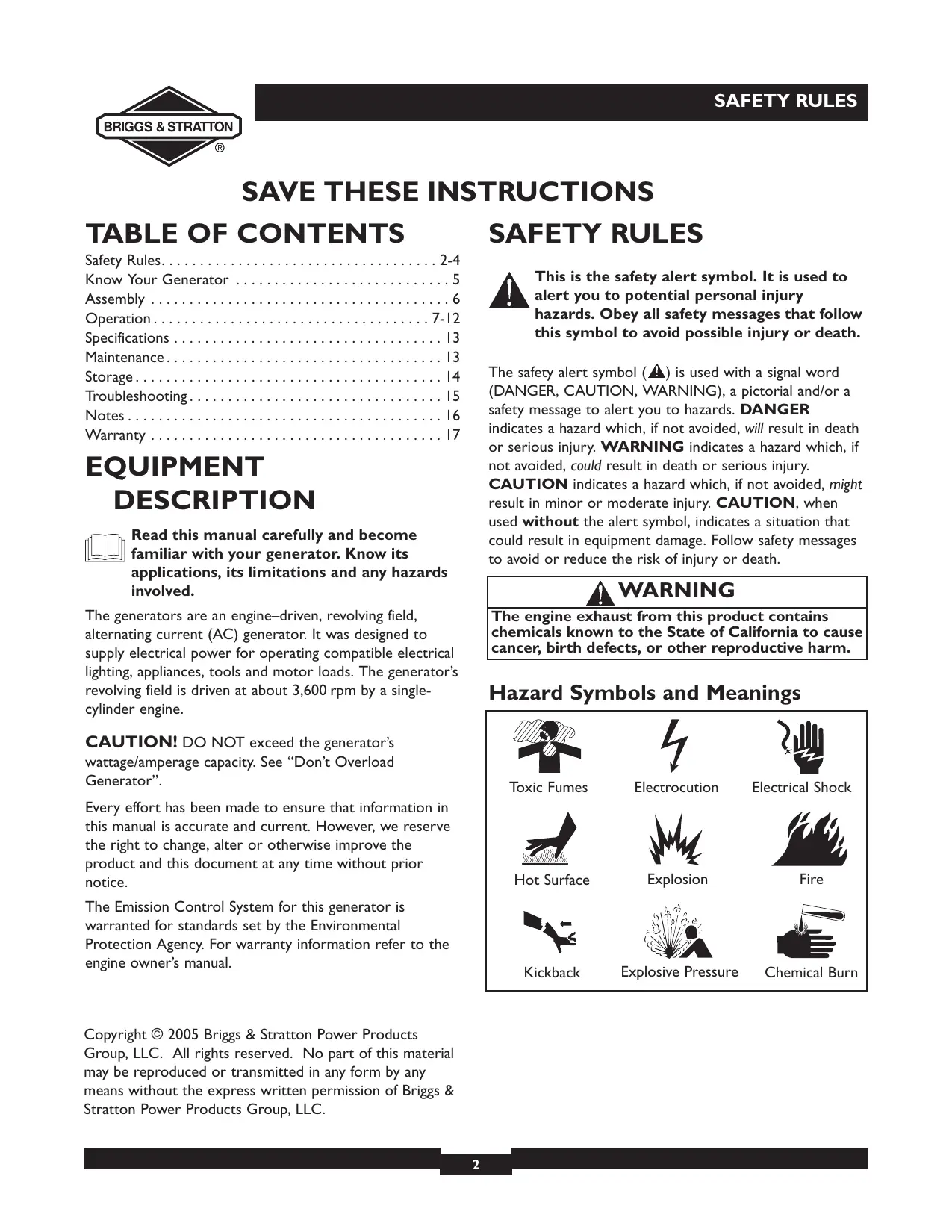 SAFETY RULES This is the safety alert symbol. It is used to alert you to potential personal injury hazards. Obey all safety messages that follow this symbol to avoid possible injury or death. The safety alert symbol ( ) is used with a signal word (DANGER, CAUTION, WARNING), a pictorial and/or a safety message to alert you to hazards. DANGER indicates a hazard which, if not avoided, will result in death or serious injury. WARNING indicates a hazard which, if not avoided, could result in death or serious injury. CAUTION indicates a hazard which, if not avoided, might result in minor or moderate injury. CAUTION, when used without the alert symbol, indicates a situation that could result in equipment damage. Follow safety messages to avoid or reduce the risk of injury or death. EQUIPMENT DESCRIPTION Read this manual carefully and become familiar with your generator. Know its applications, its limitations and any hazards involved. WARNING The generators are an engine–driven, revolving field, alternating current (AC) generator. It was designed to supply electrical power for operating compatible electrical lighting, appliances, tools and motor loads. The generator’s revolving field is driven at about 3,600 rpm by a singlecylinder engine. The engine exhaust from this product contains chemicals known to the State of California to cause cancer, birth defects, or other reproductive harm. Hazard Symbols and Meanings CAUTION! DO NOT exceed the generator’s wattage/amperage capacity. See “Don’t Overload Generator”. Every effort has been made to ensure that information in this manual is accurate and current. However, we reserve the right to change, alter or otherwise improve the product and this document at any time without prior notice. The Emission Control System for this generator is warranted for standards set by the Environmental Protection Agency. For warranty information refer to the engine owner’s manual. Copyright © 2005 Briggs & Stratton Power Products Group, LLC. All rights reserved. No part of this material may be reproduced or transmitted in any form by any means without the express written permission of Briggs & Stratton Power Products Group, LLC.