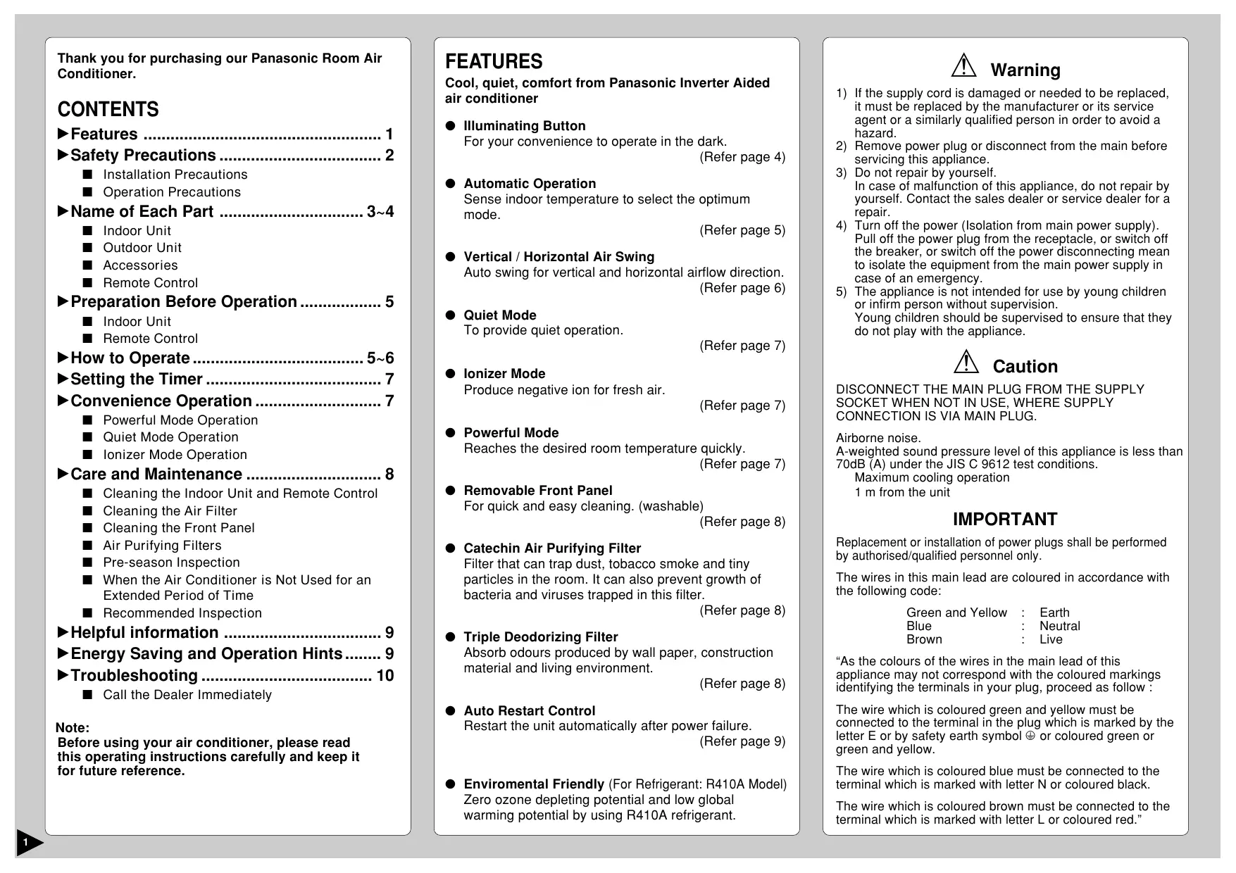 ● Illuminating Button For your convenience to operate in the dark. (Refer page 4) ● Automatic Operation Sense indoor temperature to select the optimum mode. (Refer page 5) ● Vertical / Horizontal Air Swing Auto swing for vertical and horizontal airflow direction. (Refer page 6) ● Quiet Mode To provide quiet operation. (Refer page 7) ● Ionizer Mode Produce negative ion for fresh air. (Refer page 7) ● Powerful Mode Reaches the desired room temperature quickly. (Refer page 7) ● Removable Front Panel For quick and easy cleaning. (washable) (Refer page 8) ● Catechin Air Purifying Filter Filter that can trap dust, tobacco smoke and tiny particles in the room. It can also prevent growth of bacteria and viruses trapped in this filter. (Refer page 8) ● Triple Deodorizing Filter Absorb odours produced by wall paper, construction material and living environment. (Refer page 8) ● Auto Restart Control Restart the unit automatically after power failure. (Refer page 9) ● Enviromental Friendly (For Refrigerant: R410A Model) Zero ozone depleting potential and low global warming potential by using R410A refrigerant.