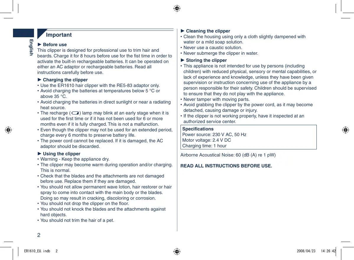 This clipper is designed for professional use to trim hair and beards. Charge it for 8 hours before use for the fist time in order to activate the built-in rechargeable batteries. It can be operated on either an AC adaptor or rechargeable batteries. Read all instructions carefully before use.
