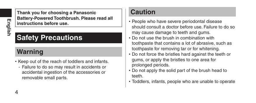 English Thank you for choosing a Panasonic Battery‑Powered Toothbrush. Please read all instructions before use. Safety Precautions Warning