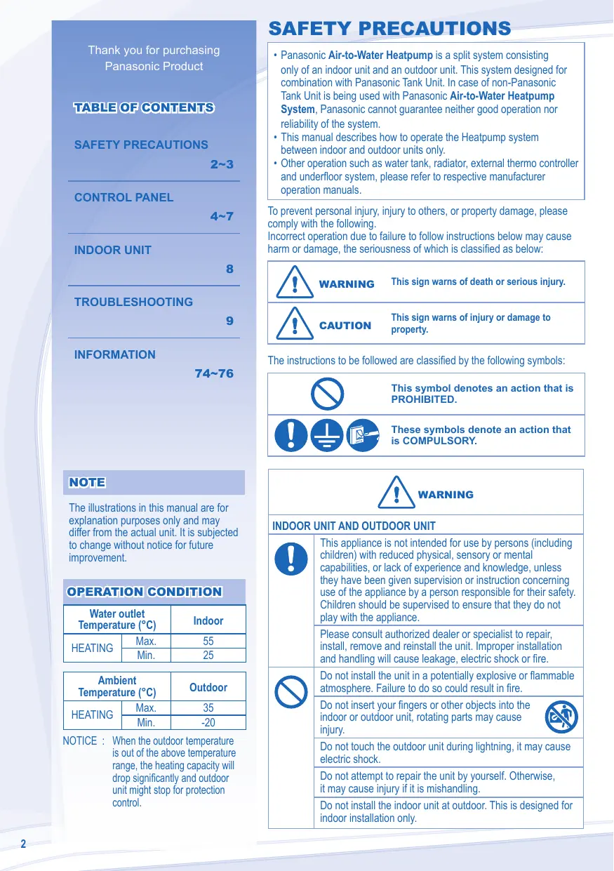 Panasonic Product TABLE OF CONTENTS SAFETY PRECAUTIONS 2~3 CONTROL PANEL 4~7 INDOOR UNIT 8