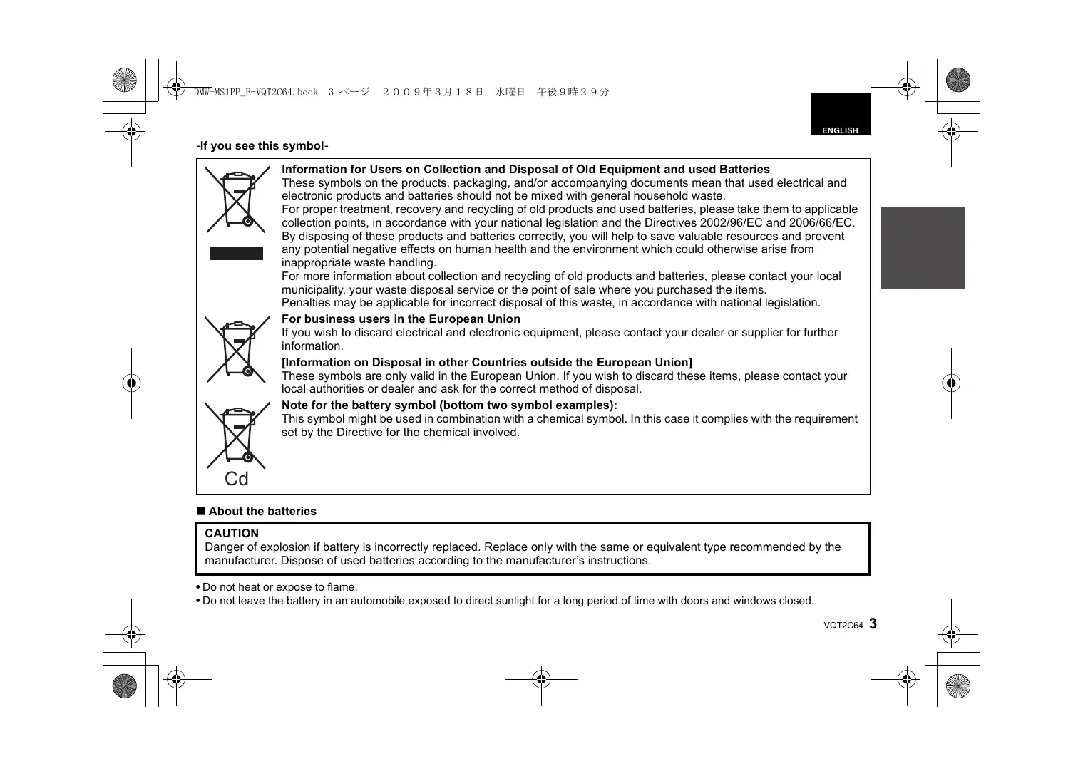 VQT2C64 -If you see this symbolInformation for Users on Collection and Disposal of Old Equipment and used Batteries These symbols on the products, packaging, and/or accompanying documents mean that used electrical and electronic products and batteries should not be mixed with general household waste. For proper treatment, recovery and recycling of old products and used batteries, please take them to applicable collection points, in accordance with your national legislation and the Directives 2002/96/EC and 2006/66/EC. By disposing of these products and batteries correctly, you will help to save valuable resources and prevent any potential negative effects on human health and the environment which could otherwise arise from inappropriate waste handling. For more information about collection and recycling of old products and batteries, please contact your local municipality, your waste disposal service or the point of sale where you purchased the items. Penalties may be applicable for incorrect disposal of this waste, in accordance with national legislation. For business users in the European Union If you wish to discard electrical and electronic equipment, please contact your dealer or supplier for further information. [Information on Disposal in other Countries outside the European Union] These symbols are only valid in the European Union. If you wish to discard these items, please contact your local authorities or dealer and ask for the correct method of disposal. Note for the battery symbol (bottom two symbol examples): This symbol might be used in combination with a chemical symbol. In this case it complies with the requirement set by the Directive for the chemical involved.