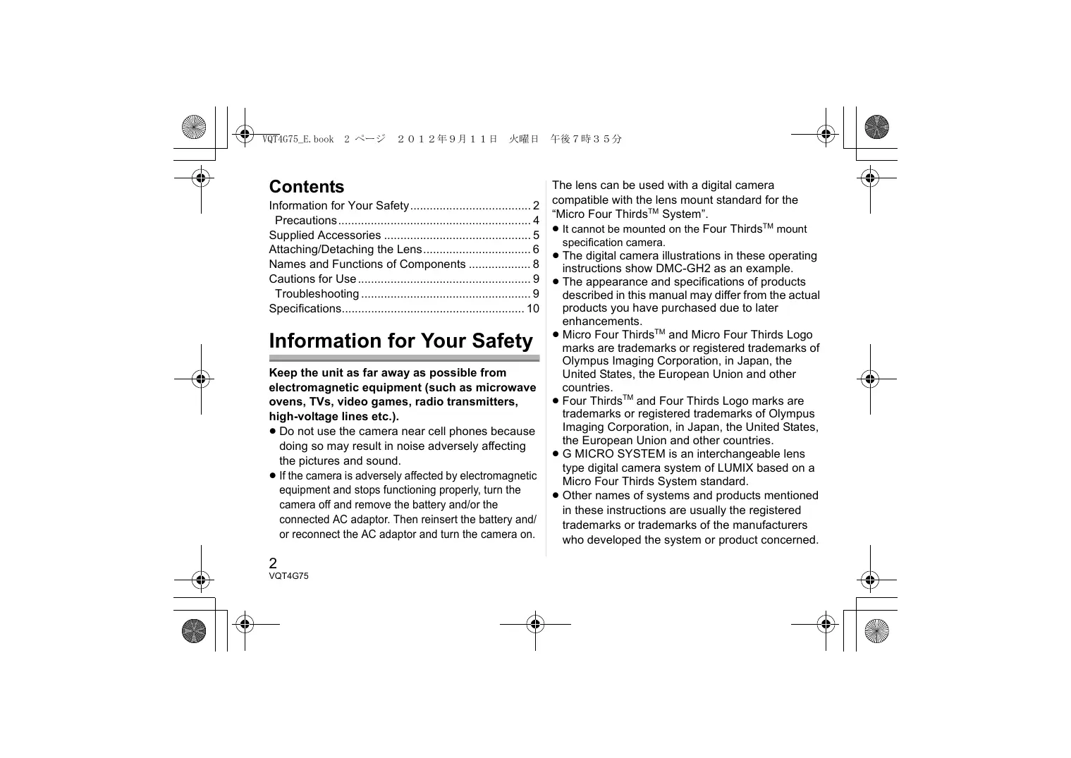 The lens can be used with a digital camera compatible with the lens mount standard for the “Micro Four ThirdsTM System”. ≥ It cannot be mounted on the Four ThirdsTM mount specification camera. ≥ The digital camera illustrations in these operating instructions show DMC-GH2 as an example. ≥ The appearance and specifications of products described in this manual may differ from the actual products you have purchased due to later enhancements. ≥ Micro Four ThirdsTM and Micro Four Thirds Logo marks are trademarks or registered trademarks of Olympus Imaging Corporation, in Japan, the United States, the European Union and other countries. ≥ Four ThirdsTM and Four Thirds Logo marks are trademarks or registered trademarks of Olympus Imaging Corporation, in Japan, the United States, the European Union and other countries. ≥ G MICRO SYSTEM is an interchangeable lens type digital camera system of LUMIX based on a Micro Four Thirds System standard. ≥ Other names of systems and products mentioned in these instructions are usually the registered trademarks or trademarks of the manufacturers who developed the system or product concerned. VQT4G75_E.book 3 ページ