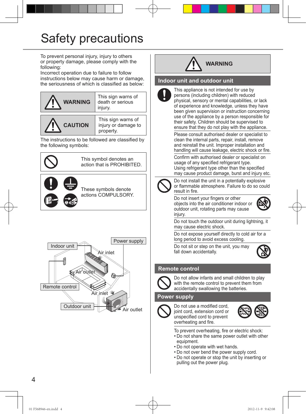 01 F568946-en.indd 3 2012-11-9 9:42:06 Safety precautions To prevent personal injury, injury to others or property damage, please comply with the following: Incorrect operation due to failure to follow instructions below may cause harm or damage, the seriousness of which is classified as below: WARNING This sign warns of death or serious injury. CAUTION This sign warns of injury or damage to property. The instructions to be followed are classified by the following symbols: This symbol denotes an action that is PROHIBITED. These symbols denote actions COMPULSORY. Power supply Indoor unit Air inlet Outdoor unit Indoor unit and outdoor unit This appliance is not intended for use by persons (including children) with reduced physical, sensory or mental capabilities, or lack of experience and knowledge, unless they have been given supervision or instruction concerning use of the appliance by a person responsible for their safety. Children should be supervised to ensure that they do not play with the appliance. Please consult authorised dealer or specialist to clean the internal parts, repair, install, remove and reinstall the unit. Improper installation and handling will cause leakage, electric shock or fire. Confirm with authorised dealer or specialist on usage of any specified refrigerant type. Using refrigerant type other than the specified may cause product damage, burst and injury etc. Do not install the unit in a potentially explosive or flammable atmosphere. Failure to do so could result in fire. Do not insert your fingers or other objects into the air conditioner indoor or outdoor unit, rotating parts may cause injury. Do not touch the outdoor unit during lightning, it may cause electric shock. Do not expose yourself directly to cold air for a long period to avoid excess cooling. Do not sit or step on the unit, you may fall down accidentally. Remote control Air outlet Remote control WARNING Do not allow infants and small children to play with the remote control to prevent them from accidentally swallowing the batteries. Air inlet Power supply Air outlet Do not use a modified cord, joint cord, extension cord or unspecified cord to prevent overheating and fire. To prevent overheating, fire or electric shock: