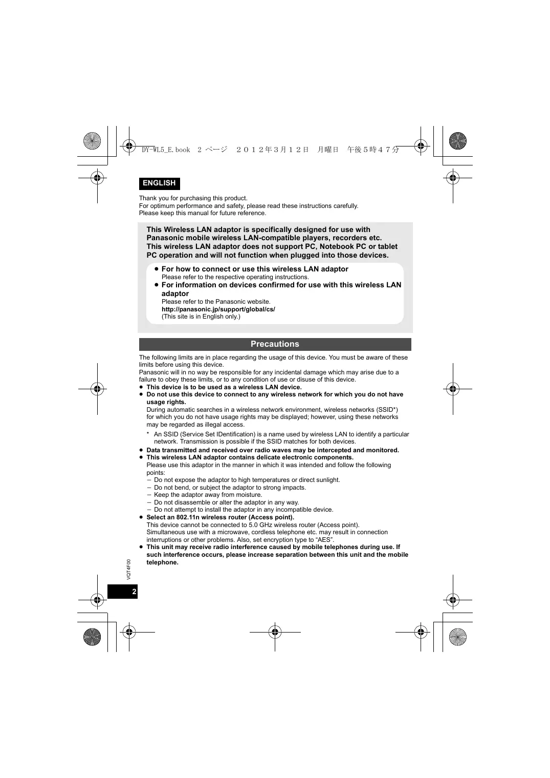 Wireless LAN Adaptor Model No. DY-WL5 VQT4F00 until 2012/3/27 DY-WL5_E.book 2 ページ