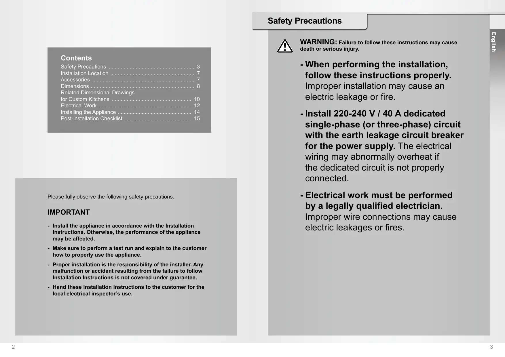 --When performing the installation, follow these instructions properly. Improper installation may cause an electric leakage or fire. --Install 220-240 V / 40 A dedicated single-phase (or three-phase) circuit with the earth leakage circuit breaker for the power supply. The electrical wiring may abnormally overheat if the dedicated circuit is not properly connected. --Electrical work must be performed by a legally qualified electrician. Improper wire connections may cause electric leakages or fires. -- Make sure to perform a test run and explain to the customer how to properly use the appliance. -- Proper installation is the responsibility of the installer. Any malfunction or accident resulting from the failure to follow Installation Instructions is not covered under guarantee. -- Hand these Installation Instructions to the customer for the local electrical inspector’s use.