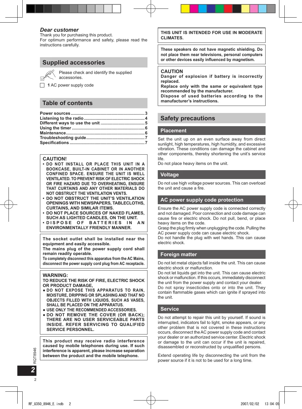2007/02/02 13:06:02 Lze naladit celkem 10 FM stanic. Přednastavení stanic Retirar as pilhas 270 mm x 152 mm x 92,5 mm Aprox. 1700 g (RF-U350) Aprox. 1650 g (RF-U300) Aprox. 1290 g (RF-U350) Aprox. 1240 g (RF-U300) I figurerna visas RF-U350. NORMAL- Denna position I figurerna visas RF-U350.