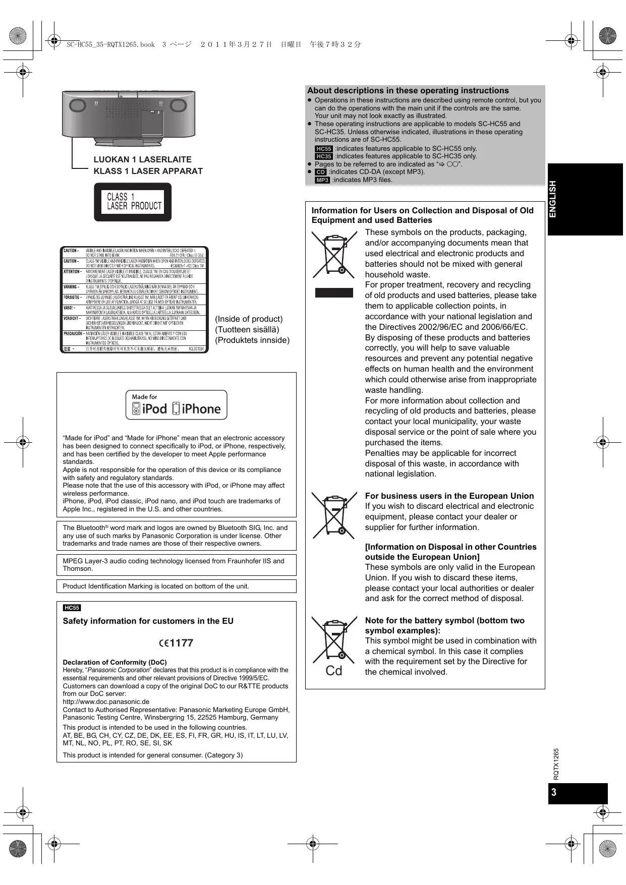 (Inside of product) (Tuotteen sisällä) (Produktets innside) “Made for iPod” and “Made for iPhone” mean that an electronic accessory has been designed to connect specifically to iPod, or iPhone, respectively, and has been certified by the developer to meet Apple performance standards. Apple is not responsible for the operation of this device or its compliance with safety and regulatory standards. Please note that the use of this accessory with iPod, or iPhone may affect wireless performance. iPhone, iPod, iPod classic, iPod nano, and iPod touch are trademarks of Apple Inc., registered in the U.S. and other countries. Information for Users on Collection and Disposal of Old Equipment and used Batteries These symbols on the products, packaging, and/or accompanying documents mean that used electrical and electronic products and batteries should not be mixed with general household waste. For proper treatment, recovery and recycling of old products and used batteries, please take them to applicable collection points, in accordance with your national legislation and the Directives 2002/96/EC and 2006/66/EC. By disposing of these products and batteries correctly, you will help to save valuable resources and prevent any potential negative effects on human health and the environment which could otherwise arise from inappropriate waste handling. For more information about collection and recycling of old products and batteries, please contact your local municipality, your waste disposal service or the point of sale where you purchased the items. Penalties may be applicable for incorrect disposal of this waste, in accordance with national legislation. ENGLISH About descriptions in these operating instructions For business users in the European Union If you wish to discard electrical and electronic equipment, please contact your dealer or supplier for further information. The Bluetooth® word mark and logos are owned by Bluetooth SIG, Inc. and any use of such marks by Panasonic Corporation is under license. Other trademarks and trade names are those of their respective owners. [Information on Disposal in other Countries outside the European Union] These symbols are only valid in the European Union. If you wish to discard these items, please contact your local authorities or dealer and ask for the correct method of disposal. MPEG Layer-3 audio coding technology licensed from Fraunhofer IIS and Thomson. Product Identification Marking is located on bottom of the unit. [HC55]