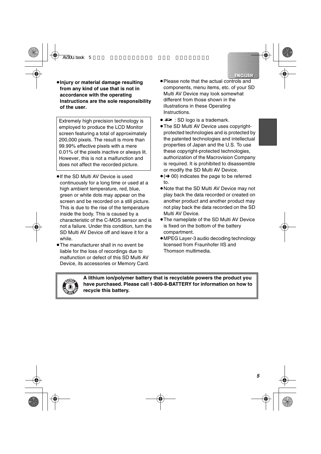 : SD logo is a trademark. ≥The SD Multi AV Device uses copyrightprotected technologies and is protected by the patented technologies and intellectual properties of Japan and the U.S. To use these copyright-protected technologies, authorization of the Macrovision Company is required. It is prohibited to disassemble or modify the SD Multi AV Device. ≥(l 00) indicates the page to be referred to. ≥Note that the SD Multi AV Device may not play back the data recorded or created on another product and another product may not play back the data recorded on the SD Multi AV Device. ≥The nameplate of the SD Multi AV Device is fixed on the bottom of the battery compartment. ≥MPEG Layer-3 audio decoding technology licensed from Fraunhofer IIS and Thomson multimedia. ≥If the SD Multi AV Device is used continuously for a long time or used at a high ambient temperature, red, blue, green or white dots may appear on the screen and be recorded on a still picture. This is due to the rise of the temperature inside the body. This is caused by a characteristic of the C-MOS sensor and is not a failure. Under this condition, turn the SD Multi AV Device off and leave it for a while. ≥The manufacturer shall in no event be liable for the loss of recordings due to malfunction or defect of this SD Multi AV Device, its accessories or Memory Card. RBRC