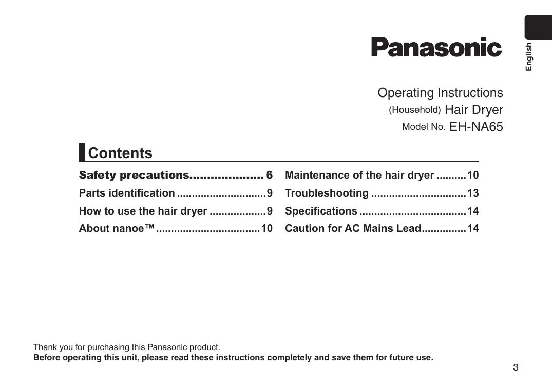 - Operating Instructions (Household) Hair Dryer Model No. EH‑NA65 Operating Instructions (Household) Hair Dryer Model No. EH‑NA65 Contents Safety precautions p. 6
