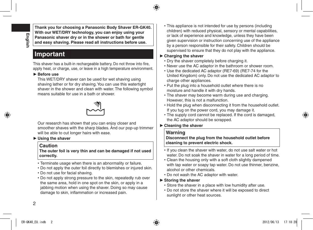 2012/06/13 17:18:20 English Thank you for choosing a Panasonic Body Shaver ER‑GK40. With our WET/DRY technology, you can enjoy using your Panasonic shaver dry or in the shower or bath for gentle and easy shaving. Please read all instructions before use. Important This shaver has a built-in rechargeable battery. Do not throw into fire, apply heat, or charge, use, or leave in a high temperature environment. ► Before use This WET/DRY shaver can be used for wet shaving using shaving lather or for dry shaving. You can use this watertight shaver in the shower and clean with water. The following symbol means suitable for use in a bath or shower. Our research has shown that you can enjoy closer and smoother shaves with the sharp blades. And our pop‑up trimmer will be able to cut longer hairs with ease. ► Using the shaver Caution The outer foil is very thin and can be damaged if not used correctly.