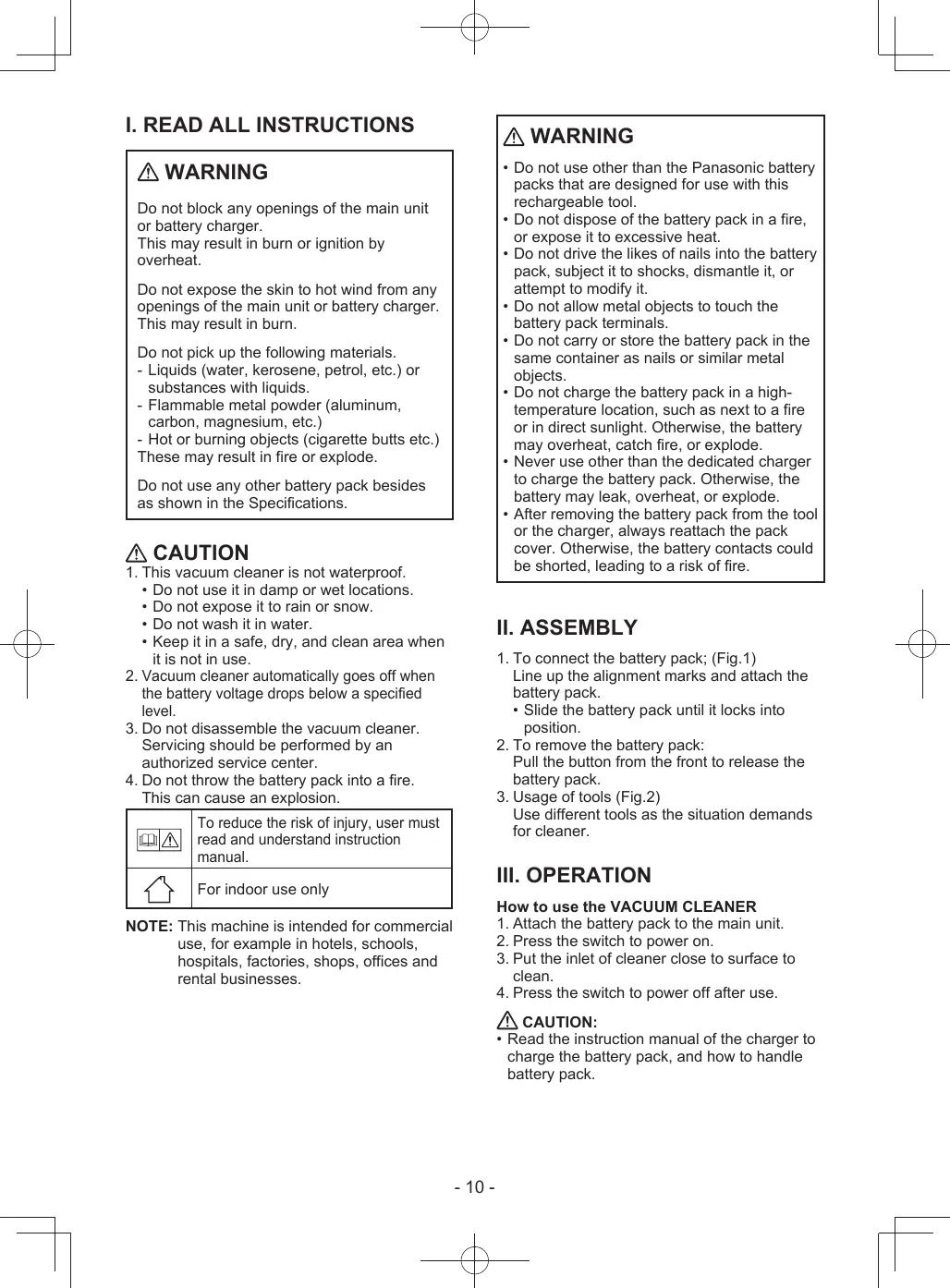 This may result in burn or ignition by overheat. Do not expose the skin to hot wind from any openings of the main unit or battery charger. This may result in burn. Do not pick up the following materials. - Liquids (water, kerosene, petrol, etc.) or substances with liquids. - Flammable metal powder (aluminum, carbon, magnesium, etc.) - Hot or burning objects (cigarette butts etc.) These may result in fire or explode. Do not use any other battery pack besides as shown in the Specifications.