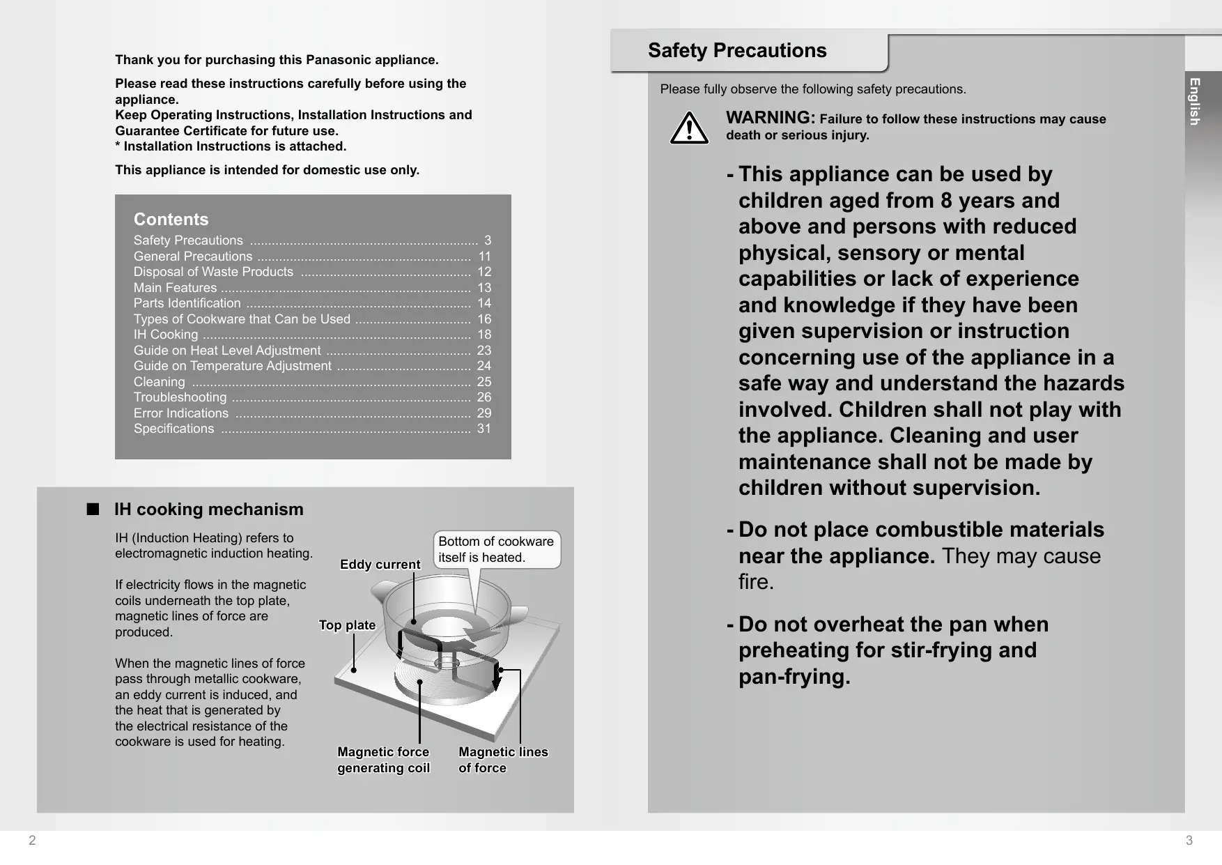 - Do not let metallic objects, such as knives, forks, spoons, lids, aluminum foil/tray, retort pouch, magnetic rings, watches or accessories, be placed on or near the top plate, or touch the cookware while the IH heater is operating. They may get hot and cause burns or injuries.