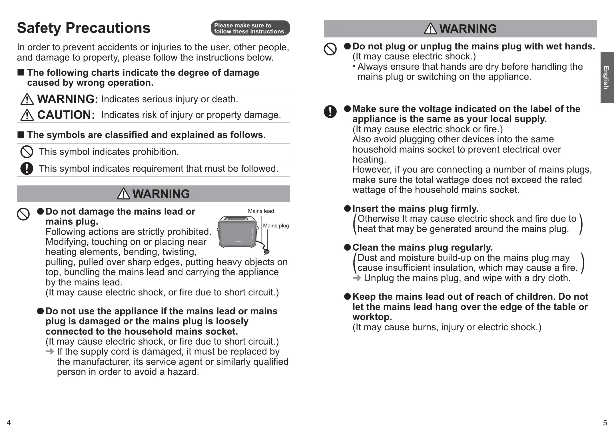 Do not plug or unplug the mains plug with wet hands. (It may cause electric shock.) ● Always ensure that hands are dry before handling the mains plug or switching on the appliance. English The following charts indicate the degree of damage caused by wrong operation. WARNING Make sure the voltage indicated on the label of the appliance is the same as your local supply. (It may cause electric shock or fire.) Also avoid plugging other devices into the same household mains socket to prevent electrical over heating. However, if you are connecting a number of mains plugs, make sure the total wattage does not exceed the rated wattage of the household mains socket. Insert the mains plug firmly. It may cause electric shock and fire due to (Otherwise heat that may be generated around the mains plug. ) Clean the mains plug regularly.