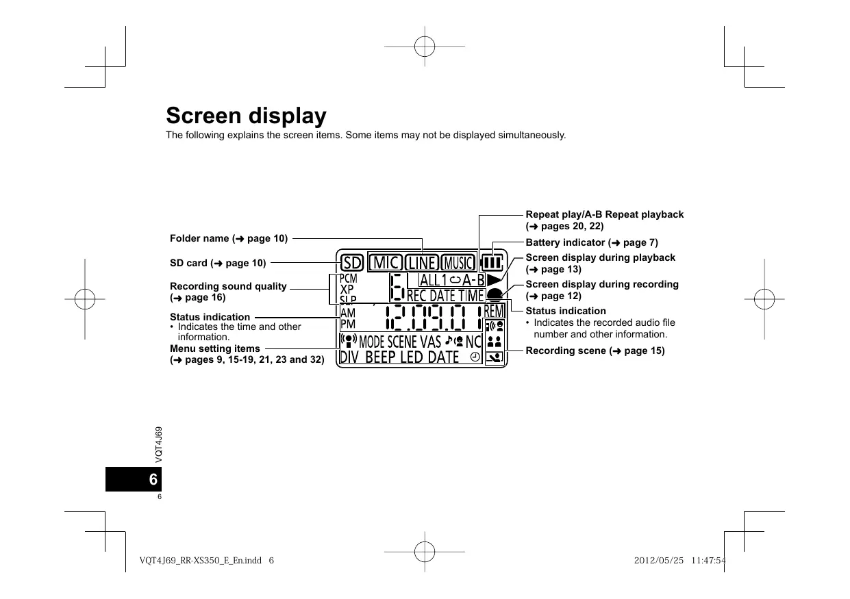 Screen display The following explains the screen items. Some items may not be displayed simultaneously. Repeat play/A-B Repeat playback (➜ pages 20, 22) Folder name (➜ page 10) Battery indicator (➜ page 7) SD card (➜ page 10) Screen display during playback (➜ page 13) Recording sound quality (➜ page 16) Screen display during recording (➜ page 12) Status indication