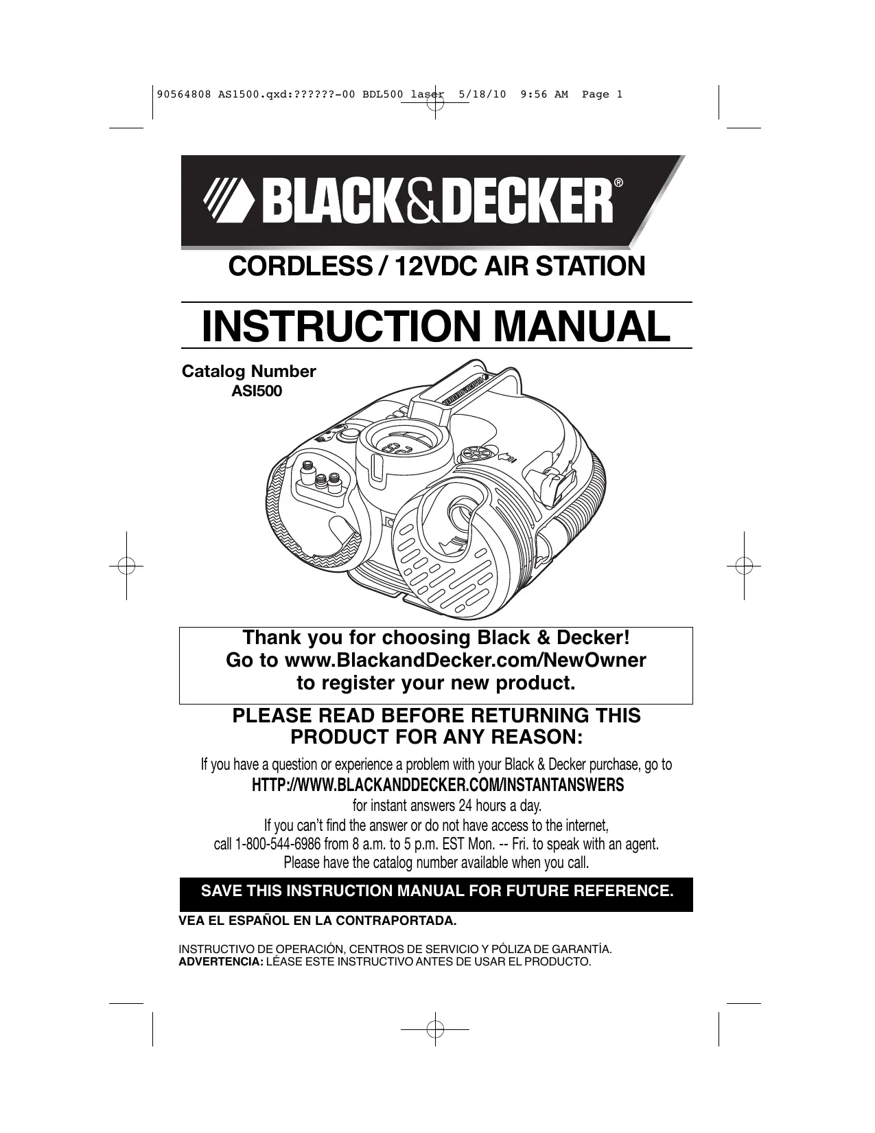 INSTRUCTION MANUAL Catalog Number ASI500 Thank you for choosing Black & Decker! Go to www.BlackandDecker.com/NewOwner to register your new product.