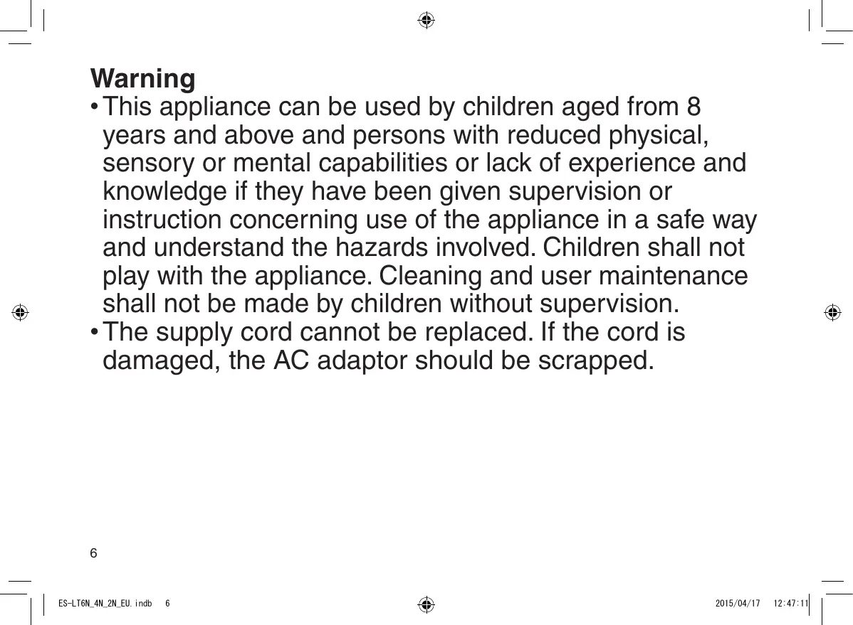 - This appliance can be used by children aged from 8 years and above and persons with reduced physical, sensory or mental capabilities or lack of experience and knowledge if they have been given supervision or instruction concerning use of the appliance in a safe way and understand the hazards involved. Children shall not play with the appliance. Cleaning and user maintenance shall not be made by children without supervision.