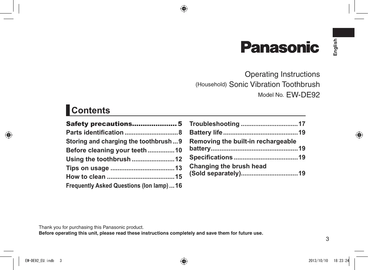 - (Household) Operating Instructions Sonic Vibration Toothbrush Model No. EW‑DE92 Contents Safety precautions p. 5