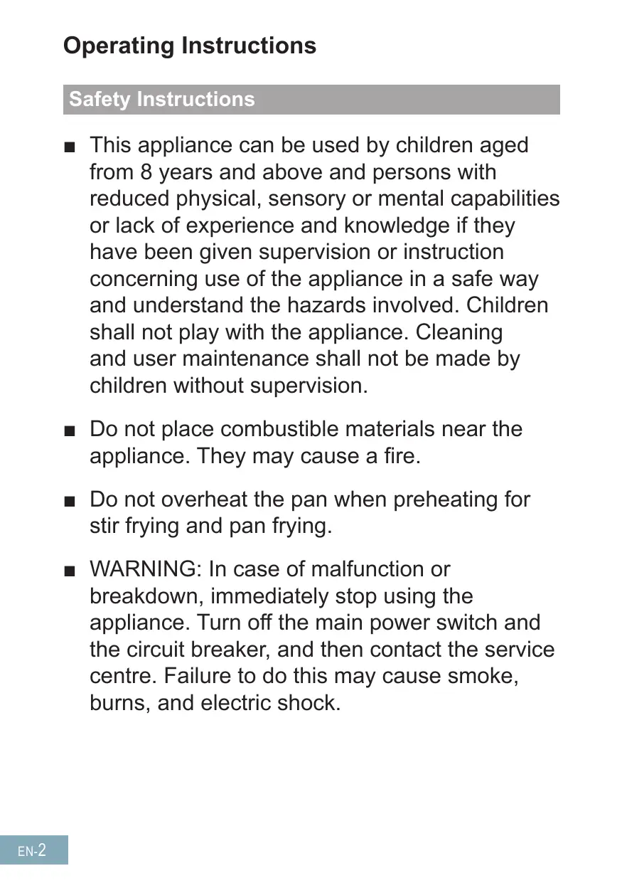- Specifications -51 English IH Cooking Mechanism IH (Induction Heating) refers to electromagnetic induction heating. When electricity flows in the magnetic coils underneath the top plate, magnetic lines of force are produced. The magnetic lines of force pass through metallic cookware when an eddy current is induced. The heat that is generated by the electrical resistance of the cookware is used for heating. Eddy current Top plate Magnetic force generating coil Magnetic lines of force EN- 1 Operating Instructions Safety Instructions ■■ This appliance can be used by children aged from 8 years and above and persons with reduced physical, sensory or mental capabilities or lack of experience and knowledge if they have been given supervision or instruction concerning use of the appliance in a safe way and understand the hazards involved. Children shall not play with the appliance. Cleaning and user maintenance shall not be made by children without supervision. ■■ Do not place combustible materials near the appliance. They may cause a fire. ■■ Do not overheat the pan when preheating for stir frying and pan frying. ■■ WARNING: In case of malfunction or breakdown, immediately stop using the appliance. Turn off the main power switch and the circuit breaker, and then contact the service centre. Failure to do this may cause smoke, burns, and electric shock. EN- 2 Safety Instructions ■■ If the power cord is damaged, it must be replaced by a service technician authorised by the manufacturer in order to avoid a hazard. ■■ Stir liquids before heating. Otherwise, liquids may splatter and cause burns or injuries. ■■ Do not apply excessive pressure or drop objects on the top plate. This may crack or damage the top plate. ■■ Do not place portable gas burners, steel cylinders and canned goods on or near the appliance. If they are heated, they may explode. ■■ After use, switch off the hob element by its control and do not rely on the pan detector. English ■■ Metal objects such as knives, forks, spoons and lids should not be placed on the hob surface as they can become hot. ■■ Do not disassemble, repair, or modify the appliance. For repairs, contact the dealer where you purchased the appliance. EN- 3 Safety Instructions ■■ WARNING: This appliance must be earthed to prevent electric shock or fire. ■■ WARNING: The appliance and its accessible parts may become hot during use. Care should be taken to avoid touching heating elements. Children less than 8 years of age shall be kept away unless continuously supervised. ■■ WARNING: Unattended cooking on a hob with fat or oil can be dangerous and may result in fire. NEVER try to extinguish a fire with water, but switch off the appliance and then cover flame with a lid or a fire blanket. ■■ WARNING: Danger of fire: do not store items on the cooking surfaces. ■■ WARNING: If the surface is cracked, switch off the appliance to avoid the possibility of electric shock. ■■ WARNING: Hob guards have not been designed for use with this appliance and should not be fitted under any circumstances. EN- 4 Safety Instructions ■■ If the oil smokes, immediately turn off the main power switch. Otherwise, it may catch fire. ■■ Take care with hot oil as it may cause burns. ■■ Take care when preheating the pan with small amounts of oil. The pan may overheat and cause damage. ■■ Do not heat empty cookware or overheat ingredients. The ingredients may burn and the cookware may be damaged. ■■ Do not use the appliance for purposes other than cooking. This may cause overheating or malfunction resulting in a fire. English ■■ If you are wearing a medical device (such as a pacemaker), consult your doctor. The operation of the appliance may affect a medical device. ■■ Do not use a steam cleaner. Water may get into the electrical components and cause damage. EN- 5 Safety Instructions ■■ The appliance is not intended to be operated by means of an external timer or separate remote control system. ■■ Do not place paper or dishcloths under the cookware. They may get scorched due to the heat of the cookware. ■■ WARNING: The manufacturer cannot be held liable for damage to persons or items caused by failure to observe the above instructions, by interference with any part of the appliance or by the use of non-original spare parts. EN- 6 General Precautions ■■ The appliance emits magnetic lines of force. Do not place anything affected by magnetism close to the appliance. -- Radios, TVs, hearing aids may be liable to noise interference. -- Cards with magnetic strips such as store or bank cards, may be erased or damaged. ■■ Do not use other IH cooking appliances, such as IH rice cooker or portable IH cooktop, on the top plate. Electromagnetic waves generated by these may damage the appliance. ■■ Do not place foods in the cabinet below the appliance. They may be spoiled by the exhaust heat. ■■ If acidic foods such as vinegar, jam, or lemon juice are spilt on the top plate, wipe off immediately. Otherwise, the top plate may become discoloured. ■■ Do not pour water on or place anything on the control panel. The control panel keys may malfunction. ■■ Do not place hot cookware on the control panel. The control panel may get damaged. ■■ Do not block the intake or exhaust vent. The appliance may become hot and automatically switch off the main power. English EN- 7 Disposal of Waste Products Information on Disposal for Users of Waste Electrical & Electronic Equipment (private households) This symbol on the products and/or accompanying documents means that used electrical and electronic products should not be mixed with general household waste. For proper treatment, recovery and recycling, please take these products to designated collection points, where they will be accepted on a free of charge basis. Alternatively, in some countries you may be able to return your products to your loc