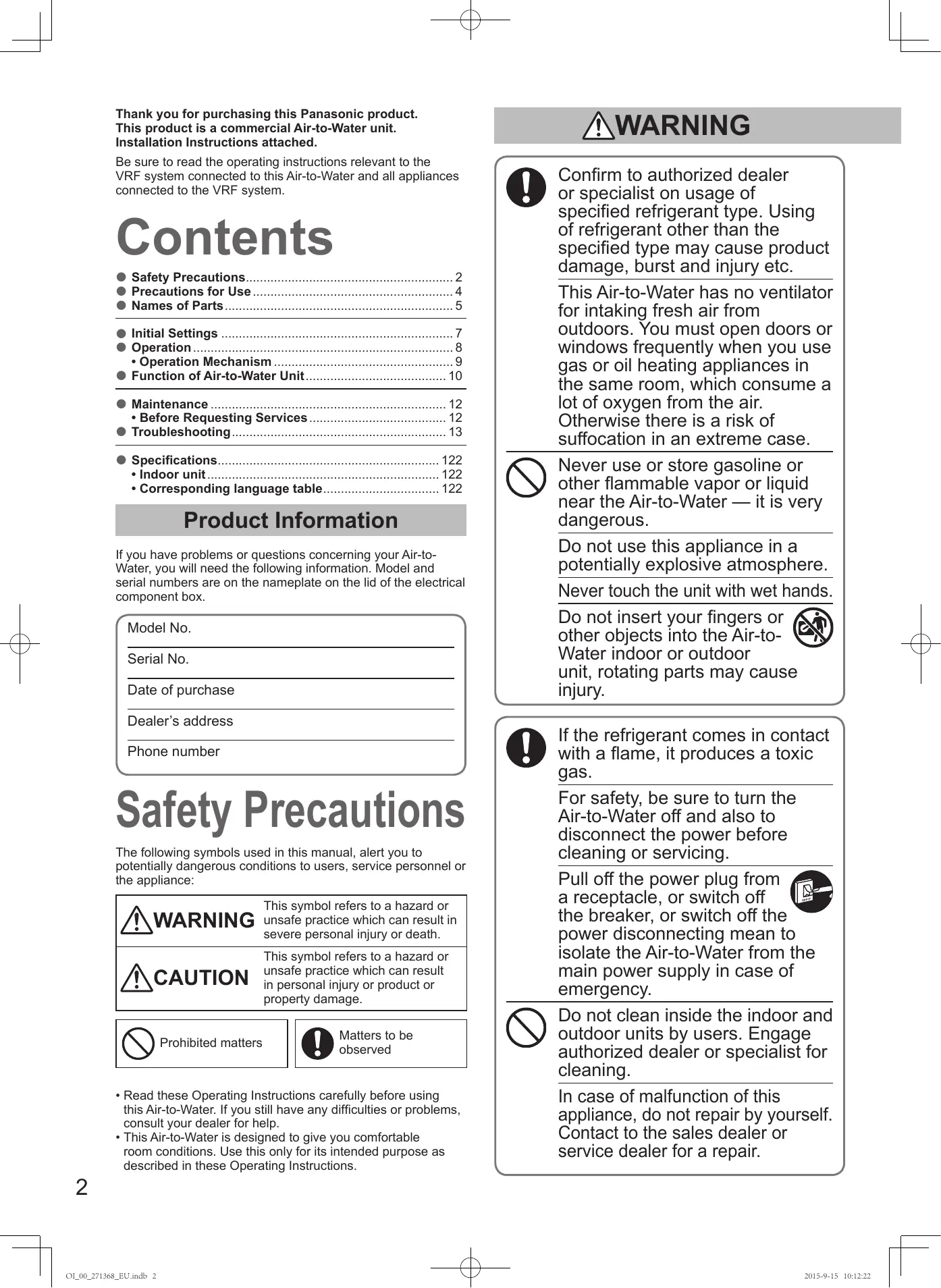 - This Air-to-Water is designed to give you comfortable room conditions. Use this only for its intended purpose as described in these Operating Instructions. OI_00_271368_EU.indb 2 WARNING Confirm to authorized dealer or specialist on usage of specified refrigerant type. Using of refrigerant other than the specified type may cause product damage, burst and injury etc. This Air-to-Water has no ventilator for intaking fresh air from outdoors. You must open doors or windows frequently when you use gas or oil heating appliances in the same room, which consume a lot of oxygen from the air. Otherwise there is a risk of suffocation in an extreme case. Never use or store gasoline or other flammable vapor or liquid near the Air-to-Water — it is very dangerous. Do not use this appliance in a potentially explosive atmosphere. Never touch the unit with wet hands. Do not insert your fingers or other objects into the Air-toWater indoor or outdoor unit, rotating parts may cause injury. If the refrigerant comes in contact with a flame, it produces a toxic gas. For safety, be sure to turn the Air-to-Water off and also to disconnect the power before cleaning or servicing. Pull off the power plug from a receptacle, or switch off the breaker, or switch off the power disconnecting mean to isolate the Air-to-Water from the main power supply in case of emergency. Do not clean inside the indoor and outdoor units by users. Engage authorized dealer or specialist for cleaning. In case of malfunction of this appliance, do not repair by yourself. Contact to the sales dealer or service dealer for a repair. 2015-9-15 10:12:22 CAUTION Provide a power outlet to be used exclusively for each unit, and a power supply disconnect, Earth Leakage Circuit Breaker (ELCB) or Residual Current Device (RCD) for overcurrent protection should be provided in the exclusive line. Provide a power outlet exclusively for each unit, and full disconnection means having a contact separation in all poles must be incorporated in the fixed wiring in accordance with the wiring rules. To prevent possible hazards from insulation failure, the unit must be grounded. Do not use modified cord, joint cord, extension cord or unspecified cord to prevent overheating and fire. Stop using the product when any abnormality/failure occurs and disconnect the power plug or turn off the power switch and breaker. (Risk of smoke/fire/electric shock) Examples of abnormality/failure: