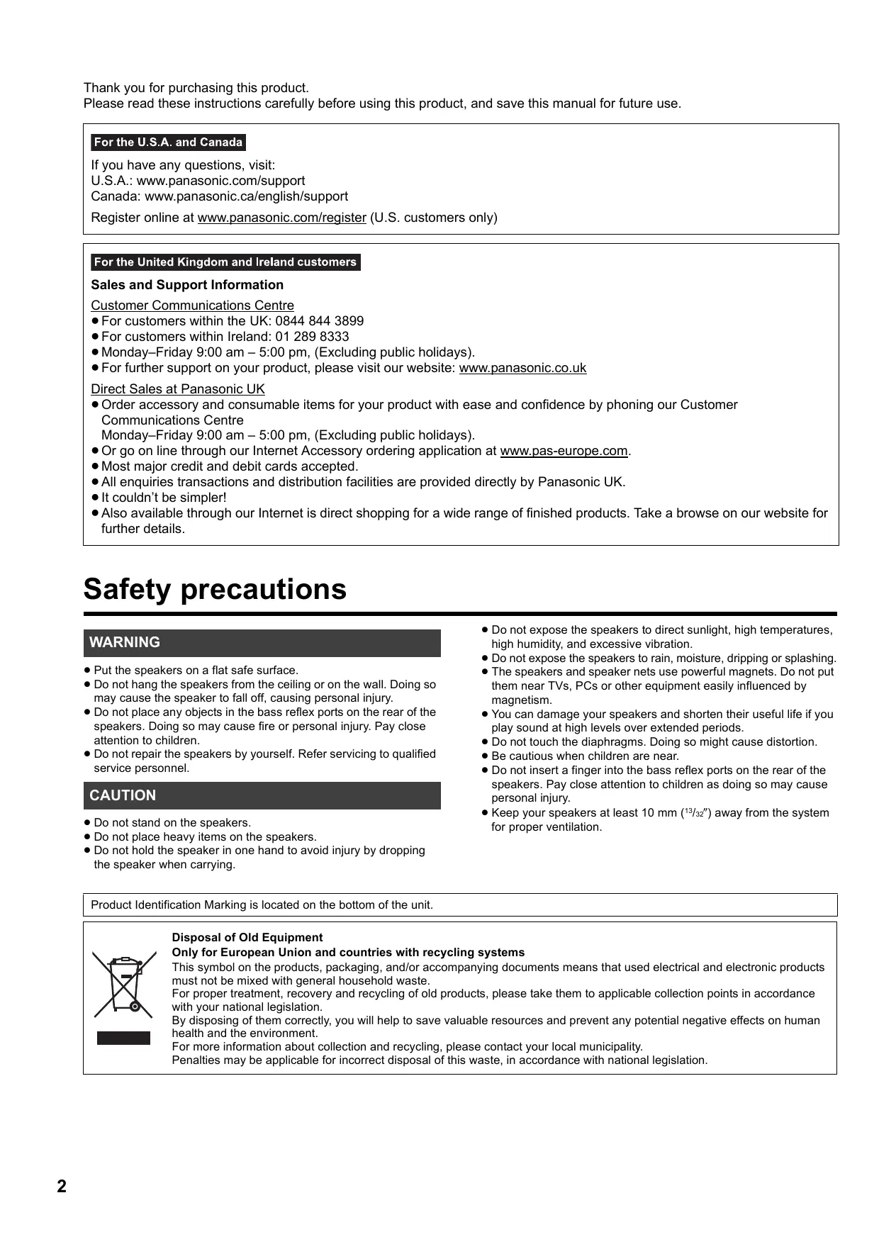 Thank you for purchasing this product. Please read these instructions carefully before using this product, and save this manual for future use. If you have any questions, visit: U.S.A.: www.panasonic.com/support Canada: www.panasonic.ca/english/support Register online at www.panasonic.com/register (U.S. customers only) Sales and Support Information Customer Communications Centre ≥ For customers within the UK: 0844 844 3899 ≥ For customers within Ireland: 01 289 8333 ≥ Monday–Friday 9:00 am – 5:00 pm, (Excluding public holidays). ≥ For further support on your product, please visit our website: www.panasonic.co.uk Direct Sales at Panasonic UK ≥ Order accessory and consumable items for your product with ease and confidence by phoning our Customer Communications Centre Monday–Friday 9:00 am – 5:00 pm, (Excluding public holidays). ≥ Or go on line through our Internet Accessory ordering application at www.pas-europe.com. ≥ Most major credit and debit cards accepted. ≥ All enquiries transactions and distribution facilities are provided directly by Panasonic UK. ≥ It couldn’t be simpler! ≥ Also available through our Internet is direct shopping for a wide range of finished products. Take a browse on our website for further details. Safety precautions WARNING ≥ Put the speakers on a flat safe surface. ≥ Do not hang the speakers from the ceiling or on the wall. Doing so may cause the speaker to fall off, causing personal injury. ≥ Do not place any objects in the bass reflex ports on the rear of the speakers. Doing so may cause fire or personal injury. Pay close attention to children. ≥ Do not repair the speakers by yourself. Refer servicing to qualified service personnel. CAUTION ≥ Do not stand on the speakers. ≥ Do not place heavy items on the speakers. ≥ Do not hold the speaker in one hand to avoid injury by dropping the speaker when carrying. ≥ Do not expose the speakers to direct sunlight, high temperatures, high humidity, and excessive vibration. ≥ Do not expose the speakers to rain, moisture, dripping or splashing. ≥ The speakers and speaker nets use powerful magnets. Do not put them near TVs, PCs or other equipment easily influenced by magnetism. ≥ You can damage your speakers and shorten their useful life if you play sound at high levels over extended periods. ≥ Do not touch the diaphragms. Doing so might cause distortion. ≥ Be cautious when children are near. ≥ Do not insert a finger into the bass reflex ports on the rear of the speakers. Pay close attention to children as doing so may cause personal injury. ≥ Keep your speakers at least 10 mm (13/32z) away from the system for proper ventilation. Product Identification Marking is located on the bottom of the unit. Disposal of Old Equipment Only for European Union and countries with recycling systems This symbol on the products, packaging, and/or accompanying documents means that used electrical and electronic products must not be mixed with general household waste. For proper treatment, recovery and recycling of old products, please take them to applicable collection points in accordance with your national legislation. By disposing of them correctly, you will help to save valuable resources and prevent any potential negative effects on human health and the environment. For more information about collection and recycling, please contact your local municipality. Penalties may be applicable for incorrect disposal of this waste, in accordance with national legislation.
