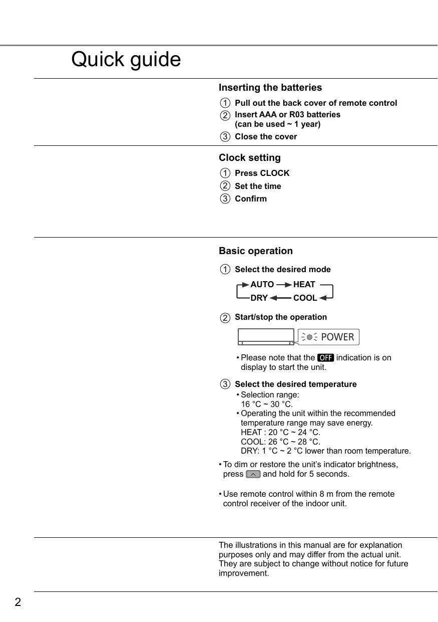 • Selection range: 16 °C ~ 30 °C. • Operating the unit within the recommended temperature range may save energy. HEAT : 20 °C ~ 24 °C. COOL: 26 °C ~ 28 °C. DRY: 1 °C ~ 2 °C lower than room temperature. • To dim or restore the unit’s indicator brightness, press and hold for 5 seconds. • Use remote control within 8 m from the remote control receiver of the indoor unit.