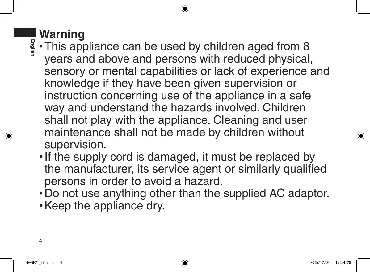 • This appliance can be used by children aged from 8 years and above and persons with reduced physical, sensory or mental capabilities or lack of experience and knowledge if they have been given supervision or instruction concerning use of the appliance in a safe way and understand the hazards involved. Children shall not play with the appliance. Cleaning and user maintenance shall not be made by children without supervision. • If the supply cord is damaged, it must be replaced by the manufacturer, its service agent or similarly qualified persons in order to avoid a hazard. • Do not use anything other than the supplied AC adaptor. • Keep the appliance dry. 4