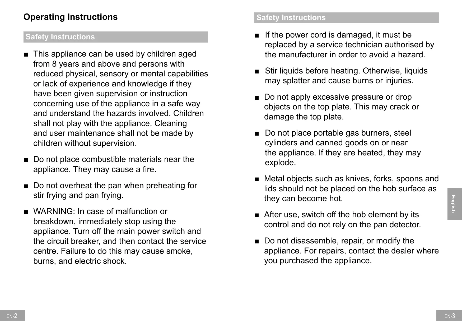 - -39 Error Codes -41 The magnetic lines of force pass through metallic cookware when an eddy current is induced. The heat that is generated by the electrical resistance of the cookware is used for heating. Eddy current Top plate Magnetic force generating coil Magnetic lines of force EN- 1 Operating Instructions Safety Instructions Safety Instructions ■■ If the power cord is damaged, it must be replaced by a service technician authorised by the manufacturer in order to avoid a hazard. ■■ This appliance can be used by children aged from 8 years and above and persons with reduced physical, sensory or mental capabilities or lack of experience and knowledge if they have been given supervision or instruction concerning use of the appliance in a safe way and understand the hazards involved. Children shall not play with the appliance. Cleaning and user maintenance shall not be made by children without supervision. ■■ Do not place combustible materials near the appliance. They may cause a fire. ■■ WARNING: In case of malfunction or breakdown, immediately stop using the appliance. Turn off the main power switch and the circuit breaker, and then contact the service centre. Failure to do this may cause smoke, burns, and electric shock. EN- 2 ■■ Do not apply excessive pressure or drop objects on the top plate. This may crack or damage the top plate. ■■ Do not place portable gas burners, steel cylinders and canned goods on or near the appliance. If they are heated, they may explode. ■■ Metal objects such as knives, forks, spoons and lids should not be placed on the hob surface as they can become hot. ■■ After use, switch off the hob element by its control and do not rely on the pan detector. English ■■ Do not overheat the pan when preheating for stir frying and pan frying. ■■ Stir liquids before heating. Otherwise, liquids may splatter and cause burns or injuries. ■■ Do not disassemble, repair, or modify the appliance. For repairs, contact the dealer where you purchased the appliance. EN- 3 Safety Instructions Safety Instructions ■■ WARNING: This appliance must be earthed to prevent electric shock or fire. ■■ If the oil smokes, immediately turn off the main power switch. Otherwise, it may catch fire. ■■ WARNING: The appliance and its accessible parts may become hot during use. Care should be taken to avoid touching heating elements. Children less than 8 years of age shall be kept away unless continuously supervised. ■■ Take care with hot oil as it may cause burns. ■■ WARNING: Unattended cooking on a hob with fat or oil can be dangerous and may result in fire. NEVER try to extinguish a fire with water, but switch off the appliance and then cover flame with a lid or a fire blanket. ■■ Do not heat empty cookware or overheat ingredients. The ingredients may burn and the cookware may be damaged. ■■ WARNING: Danger of fire: do not store items on the cooking surfaces. ■■ WARNING: Hob guards have not been designed for use with this appliance and should not be fitted under any circumstances. EN- 4 ■■ Do not use the appliance for purposes other than cooking. This may cause overheating or malfunction resulting in a fire. ■■ If you are wearing a medical device (such as a pacemaker), consult your doctor. The operation of the appliance may affect a medical device. English ■■ WARNING: If the surface is cracked, switch off the appliance to avoid the possibility of electric shock. ■■ Take care when preheating the pan with small amounts of oil. The pan may overheat and cause damage. ■■ Do not use a steam cleaner. Water may get into the electrical components and cause damage. EN- 5 Safety Instructions General Precautions ■■ The appliance is not intended to be operated by means of an external timer or separate remote control system. ■■ The appliance emits magnetic lines of force. Do not place anything affected by magnetism close to the appliance. -- Radios, TVs, hearing aids may be liable to noise interference. -- Cards with magnetic strips such as store or bank cards, may be erased or damaged. ■■ Do not place paper or dishcloths under the cookware. They may get scorched due to the heat of the cookware. ■■ Do not use other IH cooking appliances, such as IH rice cooker or portable IH cooktop, on the top plate. Electromagnetic waves generated by these may damage the appliance. ■■ WARNING: The manufacturer cannot be held liable for damage to persons or items caused by failure to observe the above instructions, by interference with any part of the appliance or by the use of non-original spare parts. ■■ If acidic foods such as vinegar, jam, or lemon juice are spilt on the top plate, wipe off immediately. Otherwise, the top plate may become discoloured. ■■ Do not place foods in the cabinet below the appliance. They may be spoiled by the exhaust heat. ■■ Do not pour water on or place anything on the control panel. The control panel keys may malfunction. ■■ Do not block the intake or exhaust vent. The appliance may become hot and automatically switch off the main power. English EN- 6 EN- 7 Disposal of Waste Products Genius Sensor Technology Information on Disposal for Users of Waste Electrical & Electronic Equipment (private households) Genius Sensor regulates the set temperature by quickly detecting the temperature on the base of the cookware. This is suitable for the following cooking modes: This symbol on the products and/or accompanying documents means that used electrical and electronic products should not be mixed with general household waste. For proper treatment, recovery and recycling, please take these products to designated collection points, where they will be accepted on a free of charge basis. Alternatively, in some countries you may be able to return your products to your local retailer upon the purchase of an equivalent new product. Genius Sensor Disposing of this product correctly 