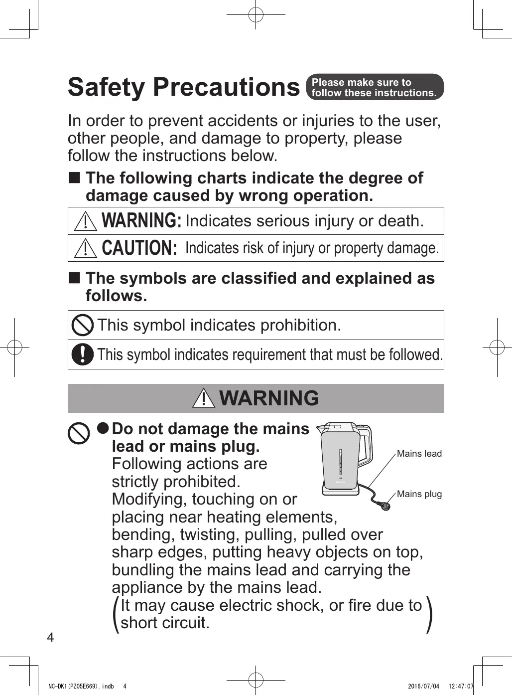 CAUTION: Indicates risk of injury or property damage. The symbols are classified and explained as follows. This symbol indicates prohibition. This symbol indicates requirement that must be followed. WARNING qqDo not damage the mains lead or mains plug. Mains lead Following actions are strictly prohibited. Mains plug Modifying, touching on or placing near heating elements, bending, twisting, pulling, pulled over sharp edges, putting heavy objects on top, bundling the mains lead and carrying the appliance by the mains lead. It may cause electric shock, or fire due to short circuit. Max