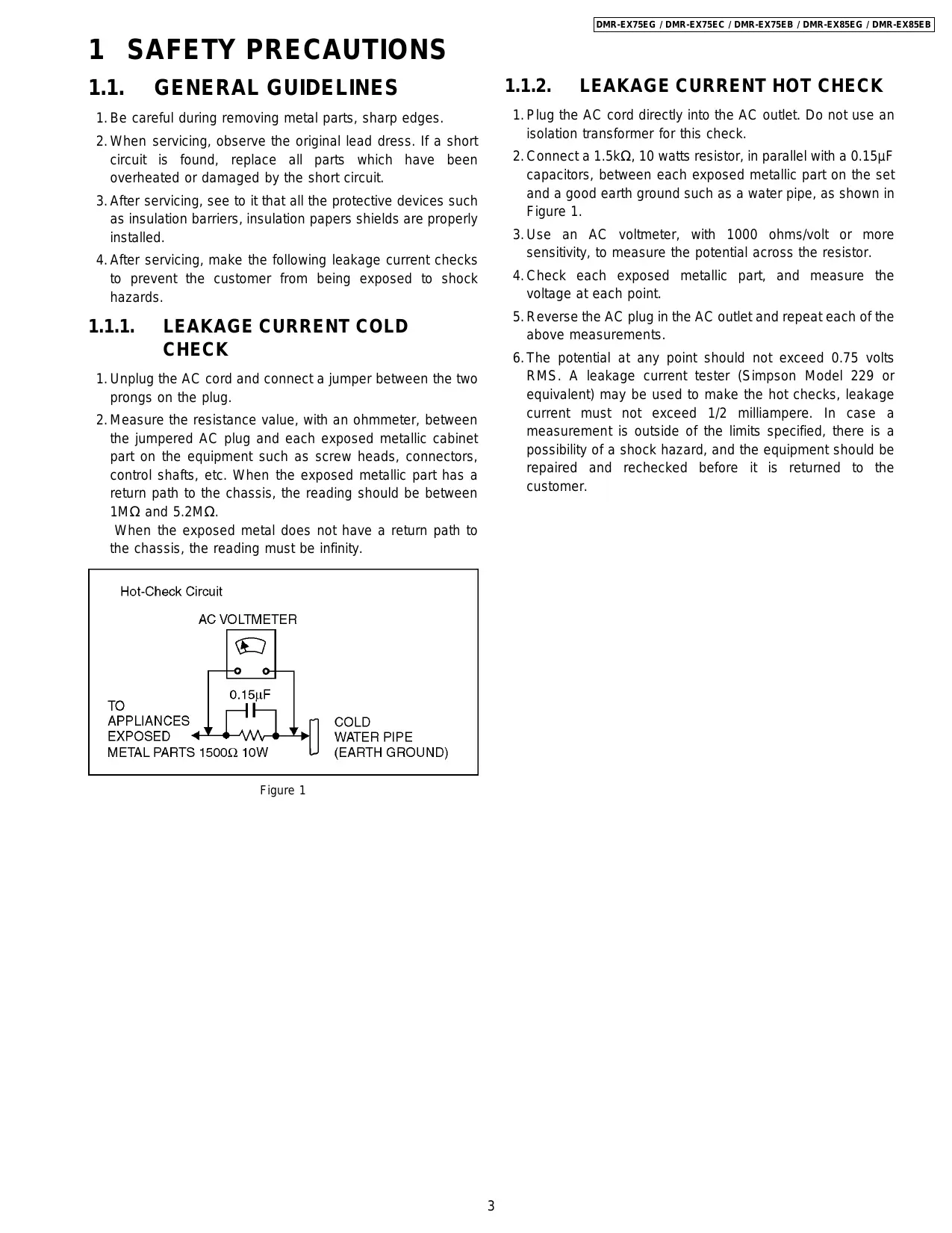 the jumpered AC plug and each exposed metallic cabinet part on the equipment such as screw heads, connectors, control shafts, etc. When the exposed metallic part has a return path to the chassis, the reading should be between 1MΩ and 5.2MΩ. When the exposed metal does not have a return path to the chassis, the reading must be infinity. Figure 1
