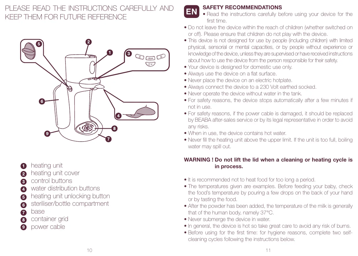 • Read the instructions carefully before using your device for the first time. • Do not leave the device within the reach of children (whether switched on or off). Please ensure that children do not play with the device. • This device is not designed for use by people (including children) with limited physical, sensorial or mental capacities, or by people without experience or knowledge of the device, unless they are supervised or have received instructions about how to use the device from the person responsible for their safety. • Your device is designed for domestic use only. • Always use the device on a flat surface. • Never place the device on an electric hotplate. • Always connect the device to a 230 Volt earthed socked. • Never operate the device without water in the tank. • For safety reasons, the device stops automatically after a few minutes if not in use. • For safety reasons, if the power cable is damaged, it should be replaced by BEABA after-sales service or by its legal representative in order to avoid any risks. • When in use, the device contains hot water. • Never fill the heating unit above the upper limit. If the unit is too full, boiling water may spill out. WARNING ! Do not lift the lid when a cleaning or heating cycle is in process. • It is recommended not to heat food for too long a period. • The temperatures given are examples. Before feeding your baby, check the food’s temperature by pouring a few drops on the back of your hand or by tasting the food. • After the powder has been added, the temperature of the milk is generally that of the human body, namely 37°C. • Never submerge the device in water. • In general, the device is hot so take great care to avoid any risk of burns. • Before using for the first time: for hygiene reasons, complete two selfcleaning cycles following the instructions below. 11