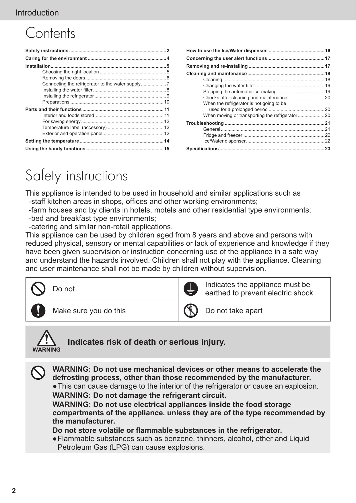 Do not operate the refrigerator in the presence of explosive fumes or flammable gas. ●This ● can cause explosion or fire. Do not store petrol or other flammable liquids and vapours in the refrigerator, or use them near the appliance. ●This ● can cause explosion or fire. Do not touch the crusher blades of the icebox. Do not poke your fingers into the hole where the ice is dispensed from the Ice/Water dispenser. ●Failure ● to do this may result in an injury to yourself. Do not try to disassemble, repair or modify the refrigerator yourself. ●You ● may injure yourself – or others – with burns or electric shock, or damage the refrigerator. If your appliance needs alterations or repair, please consult authorized service centre. Ensure that the refrigerator is plugged into an earthed mains socket. DO NOT plug into an unearthed mains socket. Remove any dirt or dust from the plug’s pins before connecting to the power supply. ●Dust ● build-up on the plug can cause insulation failure, especially in humid conditions. This can cause short circuit, fire or electric shock. Unplug the supply cord and wipe it with a dry cloth. Never use a wet or damp cloth. Plug your appliance into the socket, making sure the connection is secure. ●A ● loosely connected power plug can cause fire or electric shock. Install the refrigerator in a well-ventilated area. ●The ● more refrigerant there is in an appliance, the larger the room it should be installed in. If there’s a refrigerant fluid leak, and the appliance is in a small room, the build up of combustible gases is more likely. This can cause fire or explosion. As a guide, for every 8 g of coolant, you’ll need at least 1 cubic metre of space in the room. The data plate inside the appliance tells you how much refrigerant your refrigerator contains. Unplug the refrigerator before cleaning and servicing. ●Failure ● to do this can cause electric shock. If you smell burning or see smoke coming from the refrigerator, disconnect the power immediately and please consult authorized service centre. LED RADIATION DO NOT VIEW DIRECTLY WITH OPTICAL INSTRUMENTS CLASS 1M LED PRODUCT
