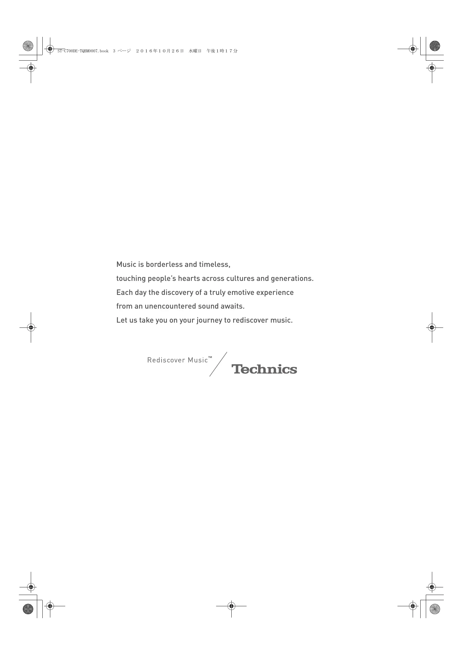 Music is borderless and timeless, touching people’s hearts across cultures and generations. Each day the discovery of a truly emotive experience from an unencountered sound awaits. Let us take you on your journey to rediscover music. ST-C700DE-TQBM0007.book 4 ページ 2016年10月26日