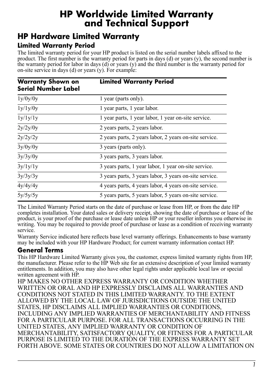 The limited warranty period for your HP product is listed on the serial number labels affixed to the product. The first number is the warranty period for parts in days (d) or years (y), the second number is the warranty period for labor in days (d) or years (y) and the third number is the warranty period for on-site service in days (d) or years (y). For example: