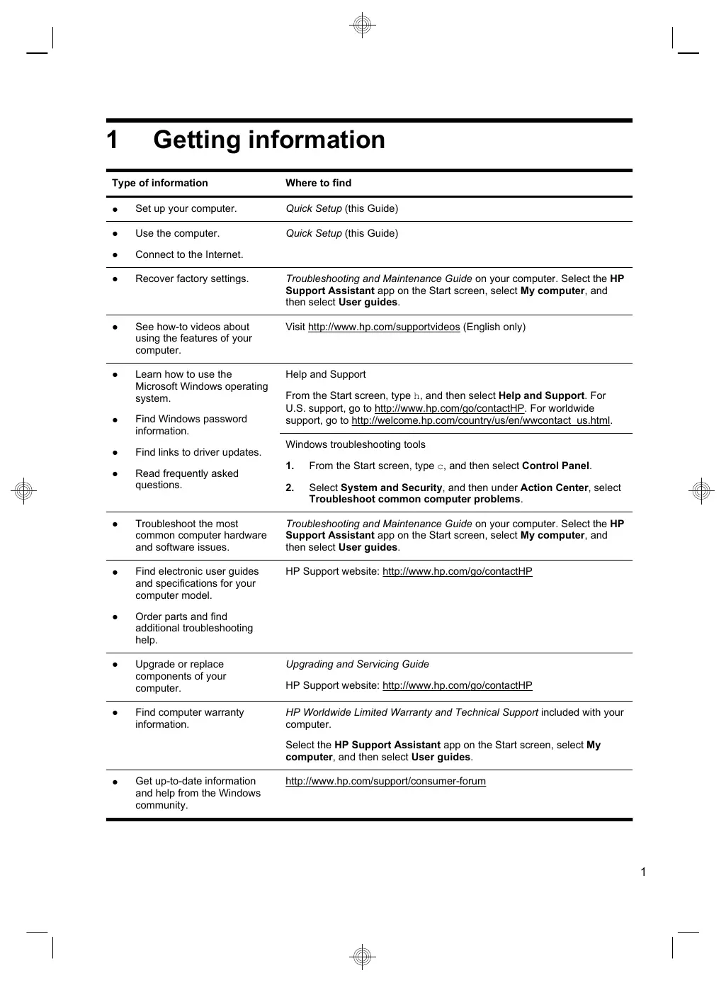 Find safety and regulatory notices. Regulatory, Safety and Environmental Notices Find ergonomic information. Safety & Comfort Guide Select the HP Support Assistant app on the Start screen, select My computer, and then select User guides or visit http://www.hp.com/go/ contactHP. Select the HP Support Assistant app on the Start screen, select My computer, and then select User guides or visit http://www.hp.com/ergo.